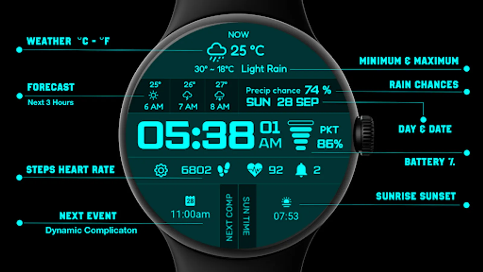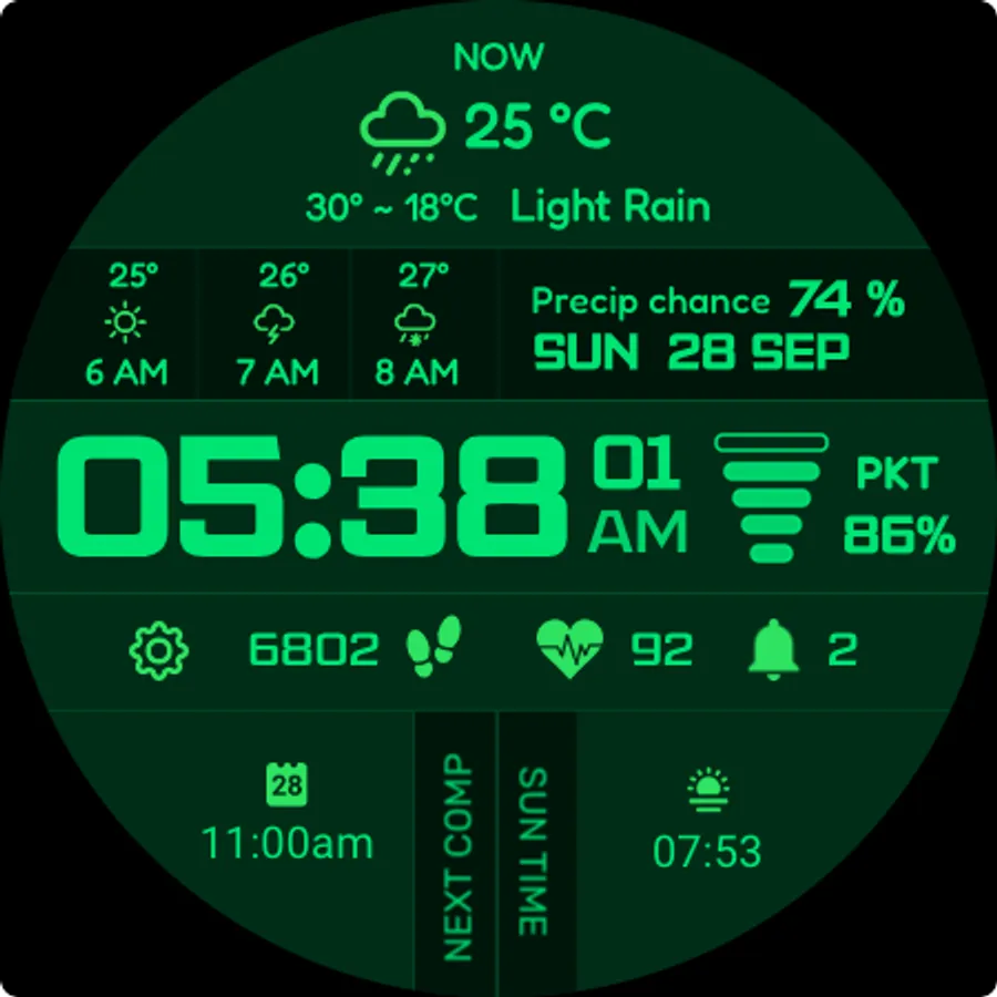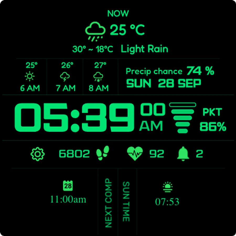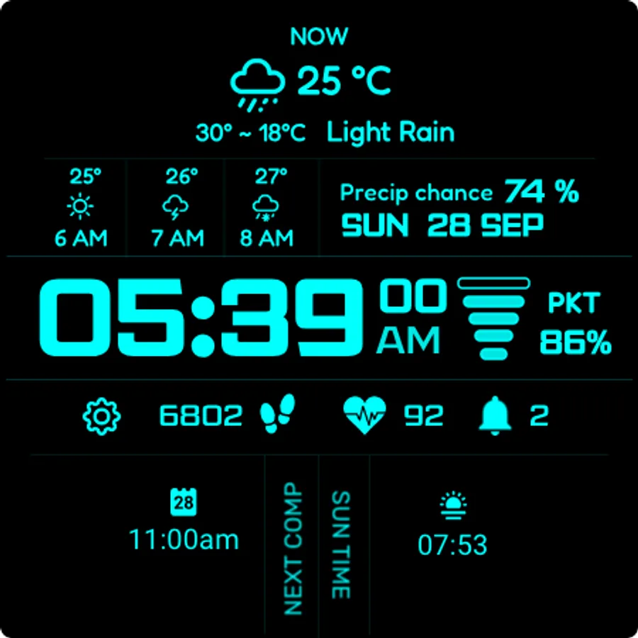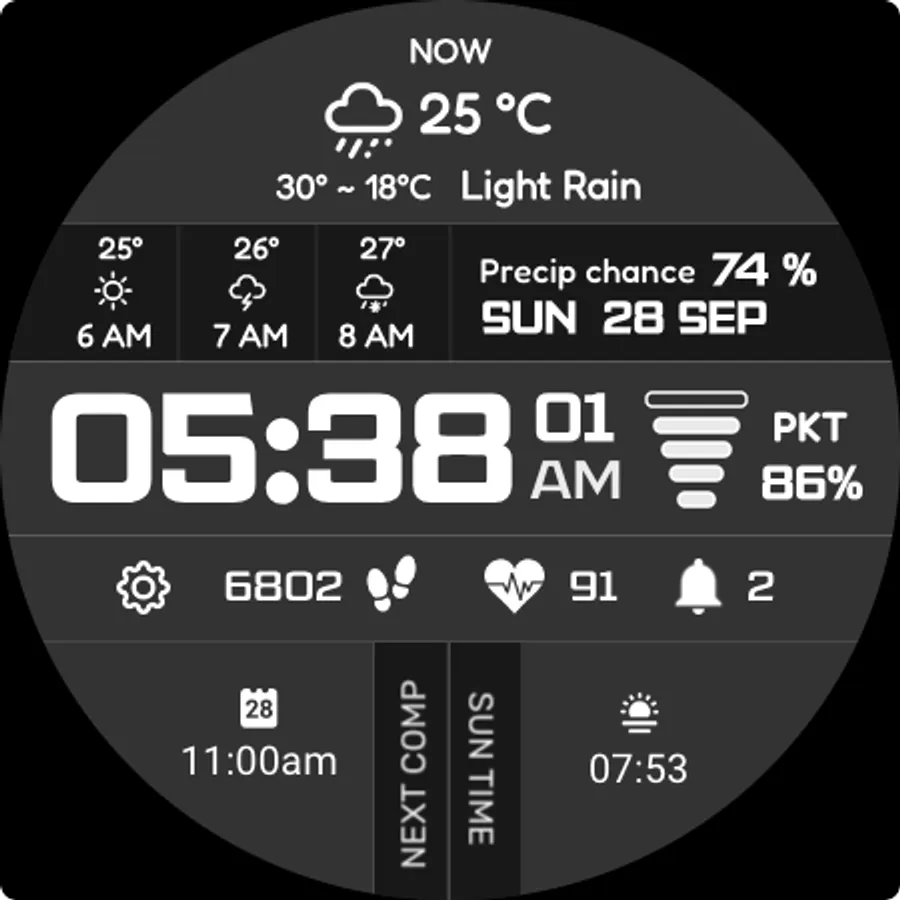 - Smart fallback: when weather data isn’t available, the watch face automatically shows battery temperature along with quick access to music, call, and calendar.