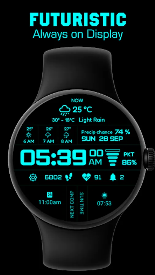 Designed for fans of sci-fi, cyberpunk and modern watch faces, it keeps you connected with style.