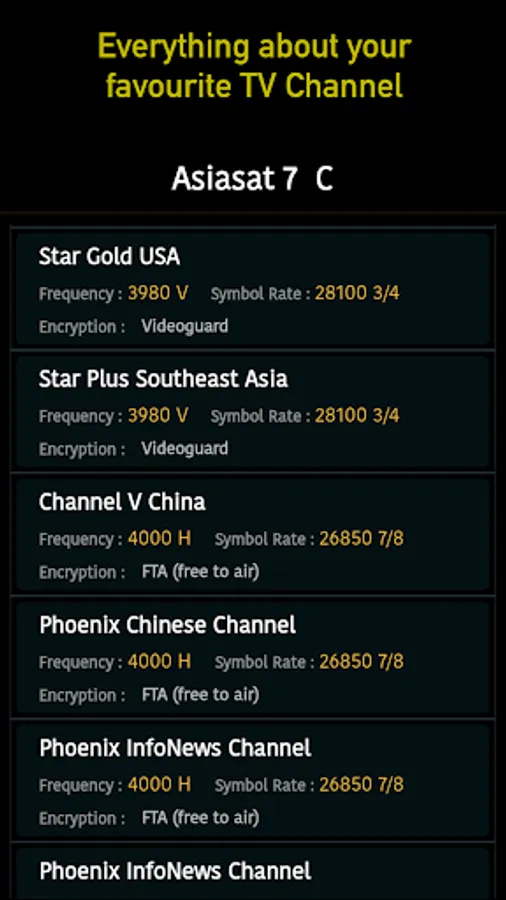 TV Channels Data contains Satellite information, Frequency, Symbol Rate, Biss or Power VU Keys (if any).