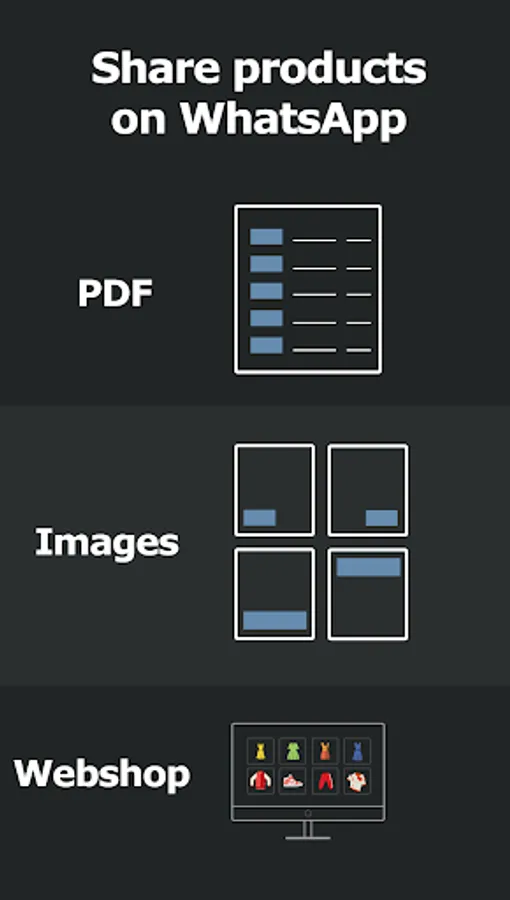 Simply download the app, register and upload your product images. Share product catalogs(catalogues) as PDF on WhatsApp and you can start receiving orders on WhatsApp