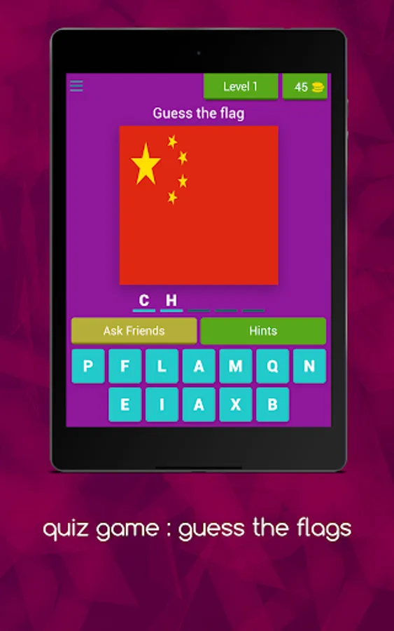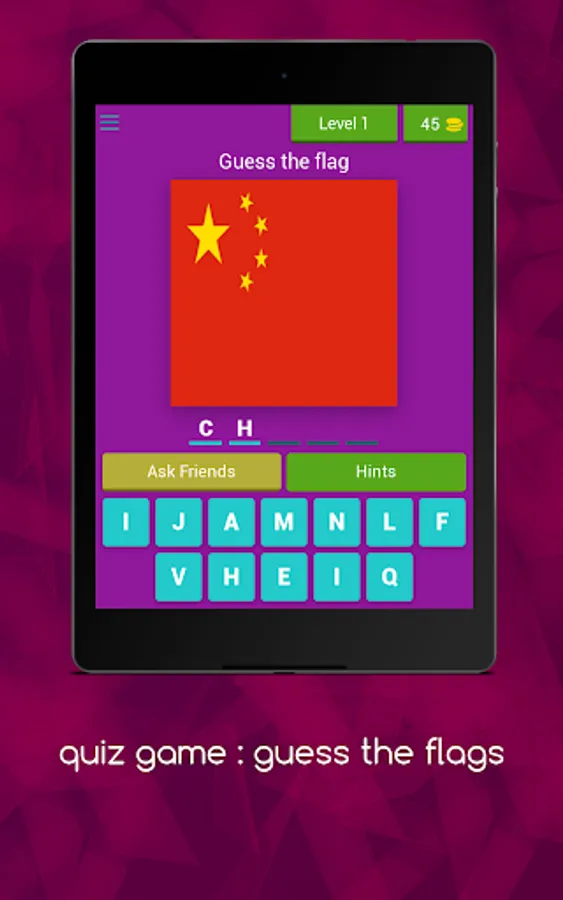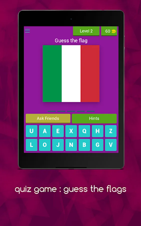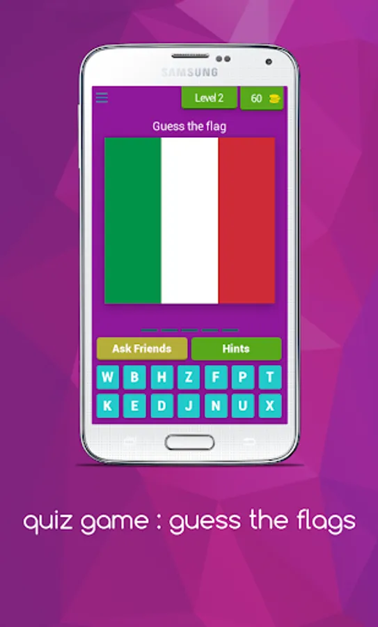 This is a game that contains 50 levels and the levels are flags of countries. Every time you pass a level you win one coin and the coins help you solve the levels if you find difficulty that contains a country flag where the game depends on intelligence and activates memory that adds information to you.