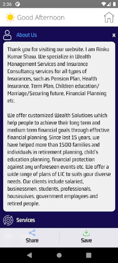 This Application is very helpful for my customers or the public to getting touch with me for taking financial consultations and to know more about me.