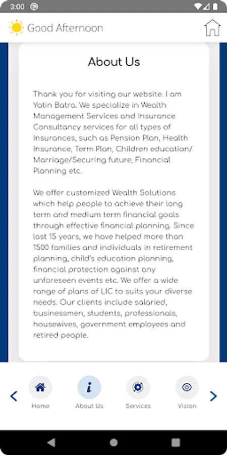 This Application is very helpful for my customers or the public to getting touch with me for taking financial consultations and to know more about me.