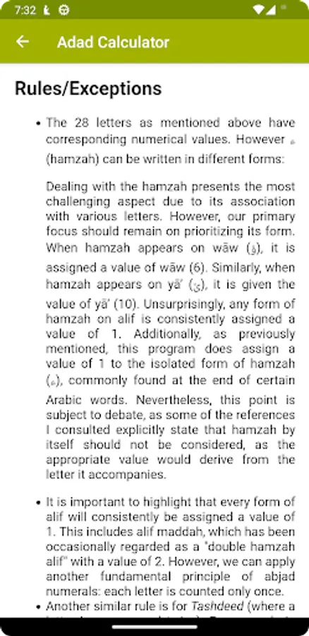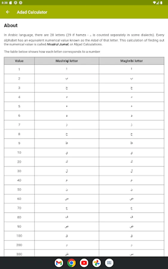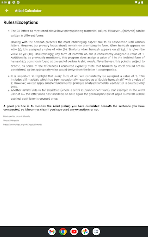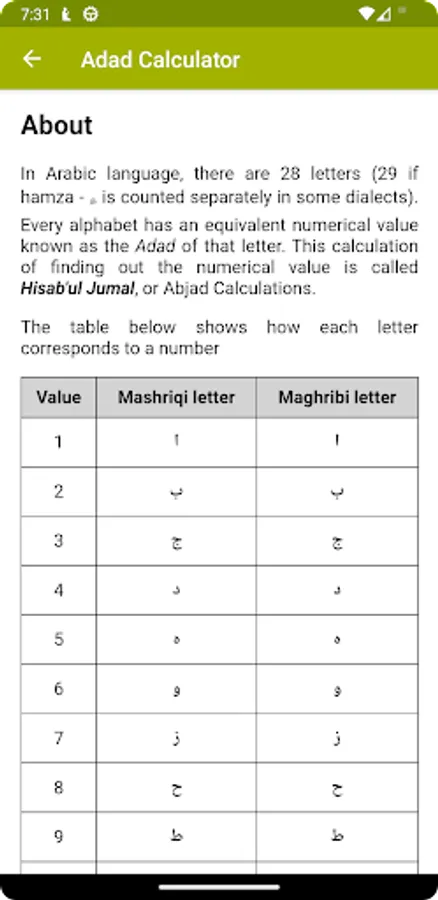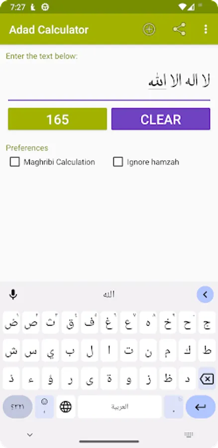 This Adad Calculator is the FIRST application of this kind on the Google PlayStore. This application can be used to calculate the numerical value (Adad) of any word, phrase or even sentences, including but not limited to any Quran verse, name of a person, place or entity etc.