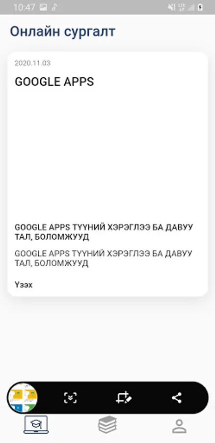 Алсын зайн сургалтын хөтөч буюу “Zainbagsh” хөтөлбөрийг та УХААЛАГ гар утас болон таблет төхөөрөмжүүд дээр суулгаснаар “Google Apps” болон бусад программ дээр хэрхэн ажиллаж болох талаар slide хичээл ба видео хичээлийн хамт үзэх боломжтой.