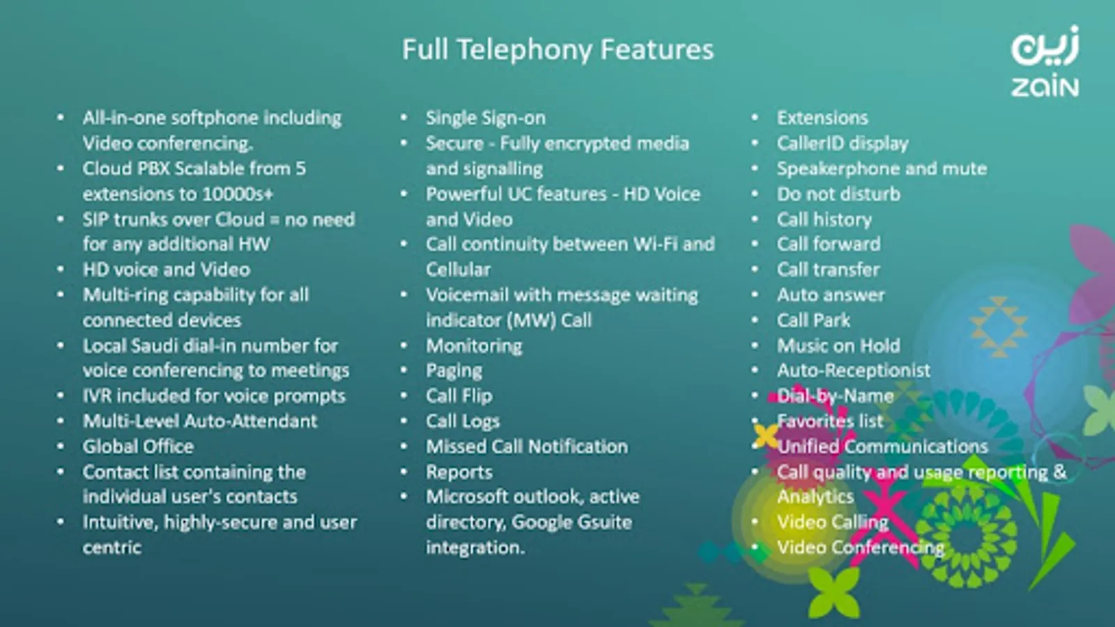 Enable a BYOD solution, and save money on calling plans using ZainCalls which puts business-class communications tools in your pocket so no matter where you are in the world, you stay connected.