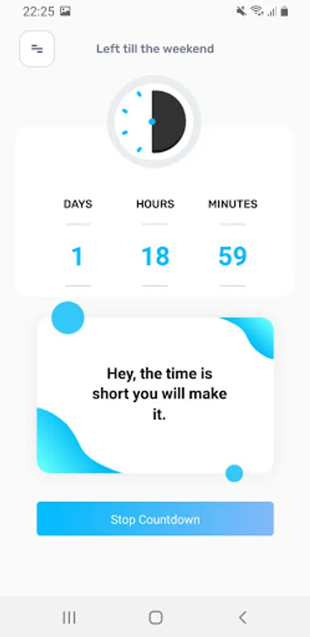 Monday morning, you start work wondering how much time left till you will have the weekend again, we have all been there... many times... Friday you log out of your computer and suddenly you blossom with the news of starting the weekend. Lots of energy, meeting with friends, shopping spree, sport activities, cleaning your home or just spending time on your hobby. Everybody is looking forward to it. This app will help you track how much time left till your next weekend and keep you motivated during your the week.
