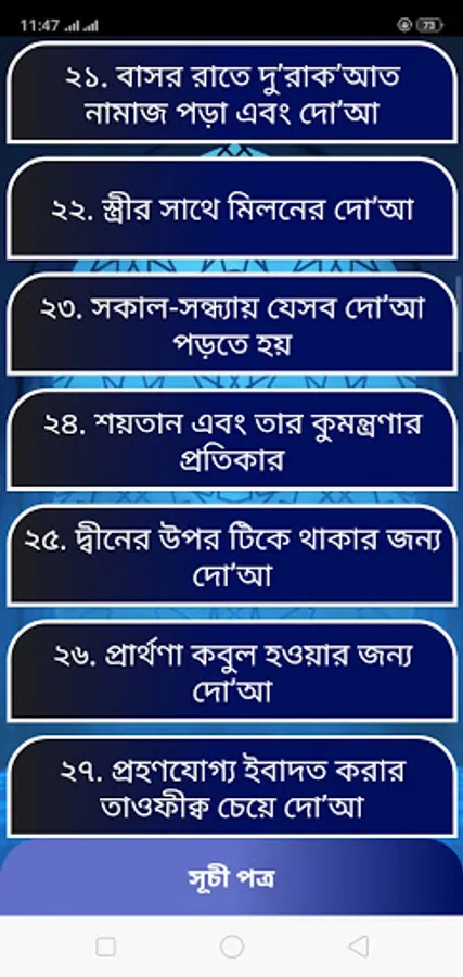 বাংলা দোয়া (Bangla Dua) - প্রতিদিনের দোয়ার ভাণ্ডার ( doyar vandar ) is one of the best Islamic apps in Bangla that presents daily Arbi Duas with Bangla Meaning and Pronunciation.
