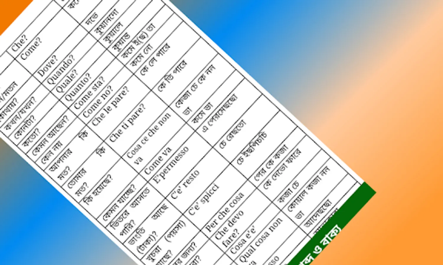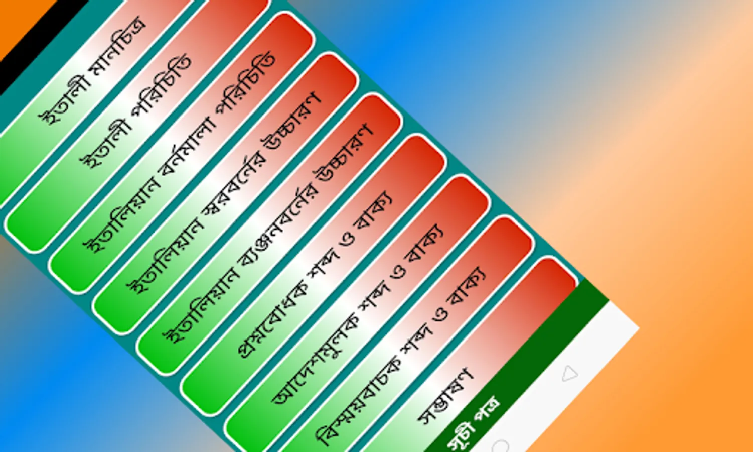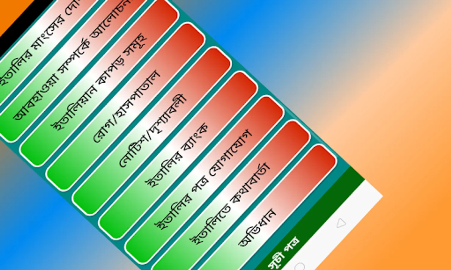 ইতালীয়ান ভাষা শিখুন is a remarkable Bangla to Italian language learning app. Learn Italy language free without having any difficulty! Our app offers effective guidelines and useful phrases for conversation. It is an offline app that is lightweight, which means you don’t have to spend a lot of megabytes to download and use this amazing Italy language app.
