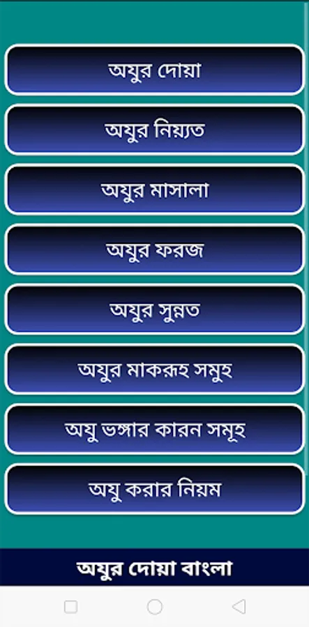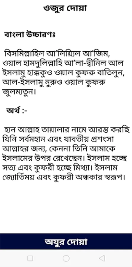 আপনাদের সুবিধার জন্য নিয়ে এলাম Ojur Dua Bangla (অযুর দোয়া বাংলা) app. অজুর দোয়া এবং সকল মাসালা জানুন বাংলাউচ্চারণ এবং বাংলা অর্থসহ।