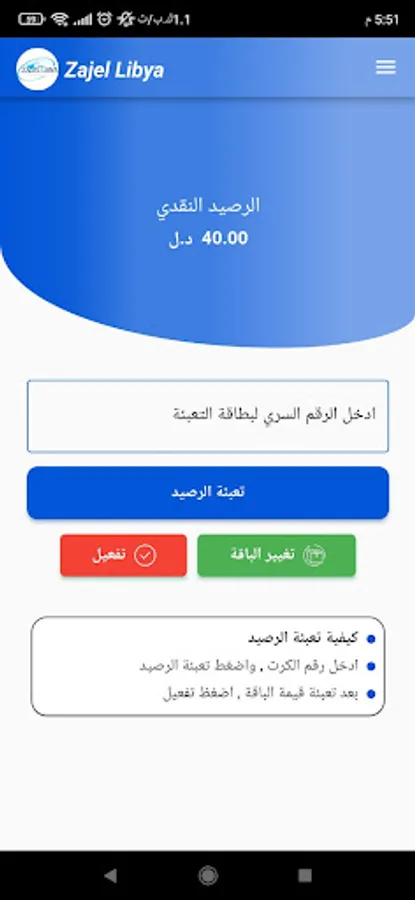 An application that helps you view all your account data, including the remaining quota, expiration date, and your balance. You can also charge the balance through it, change the package, and see your signal and its details. You can also communicate with technical support and see everything related to Zajil Libya, including new news and others....