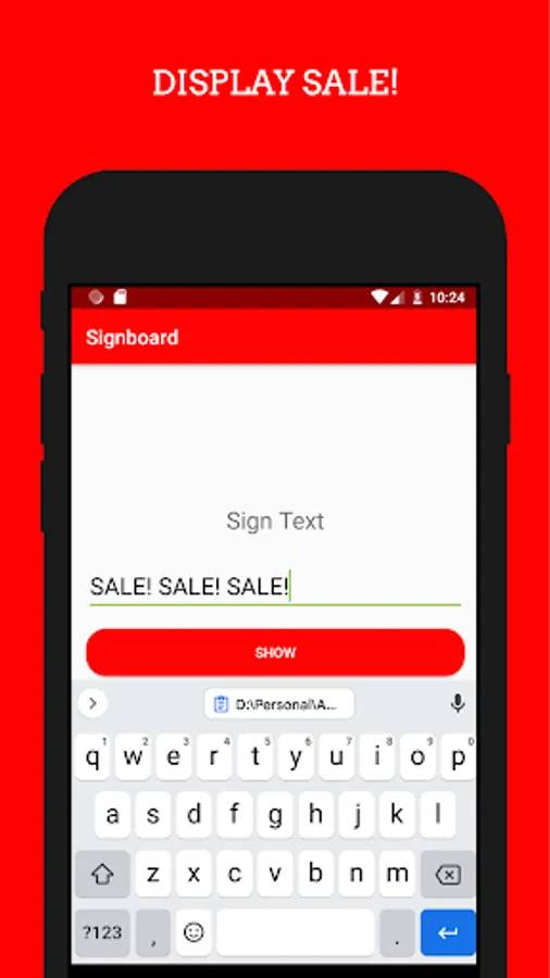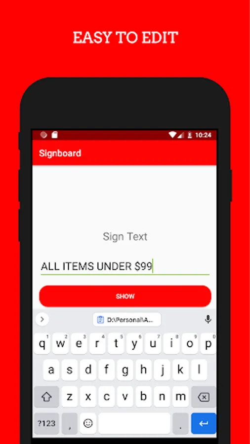 Signboard is the most reliable, easy to use application to display any text on your mobile phone screen. Type anything in any language with emoji and symbols and show it on full screen in your phone display. Whether you need help or need to inform people about something, this app will save your day. Sometime we do not have a printer or a paper to let people know. But if you install this app, it will help you anytime any place.