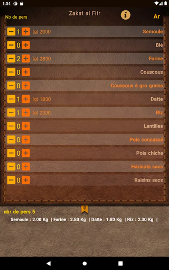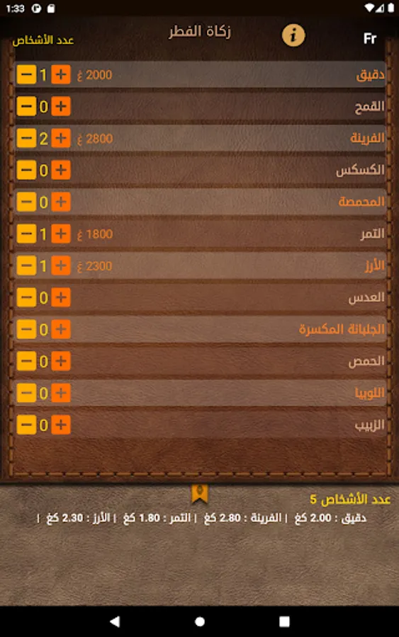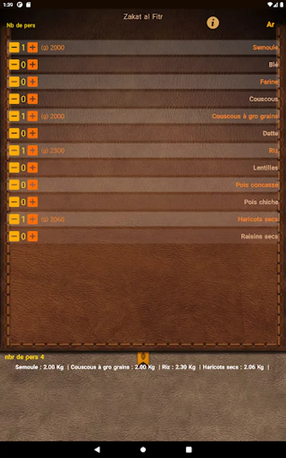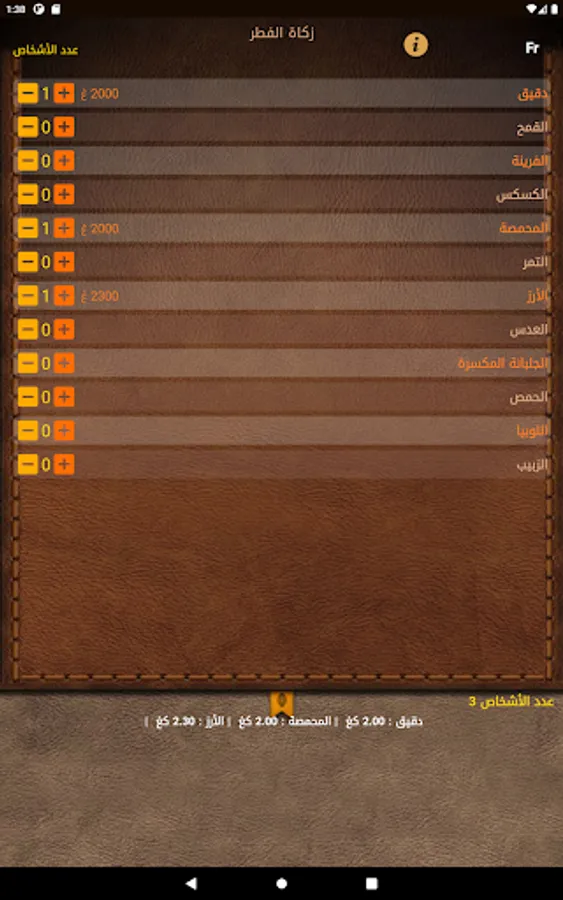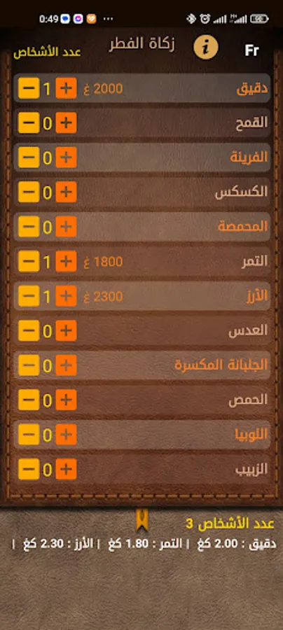 Users can enter information about the family members who must pay zakat al-fitr, such as the number of people and the type of food they want to give to each member. The app displays a list of different foods and users can select the foods they want to take out.