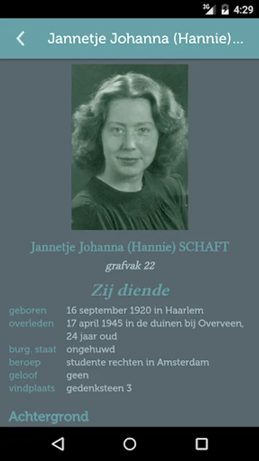 The Eerebegraafplaats Bloemendaal is the monument to the Dutch resistance fighters killed during the Second World War. There are 372 members of the resistance, 371 men and one woman, Hannie Schaft. This app provides information about this particular monument.