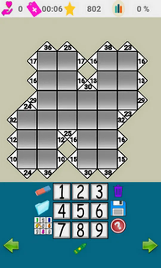 is looks a lot like crosswords, but with numbers instead of letters, a vertical or horizontal word consists of numbers between 1 and 9, a number does not repeat itself in a word, the sum of the number result of the word in column or line is equal to the number indicated in the triangles on the right or on the top .