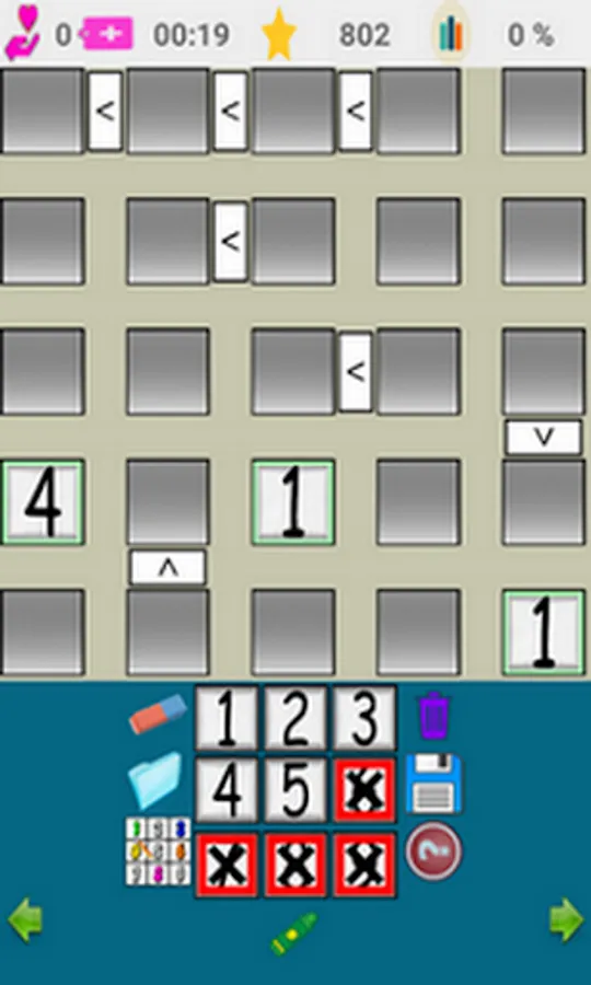 the objective is to constitute vertical or horizontal words such that a word consists of numbers between 1 and X (X is the dimention of the grid), the signs> and < are upper and lower.