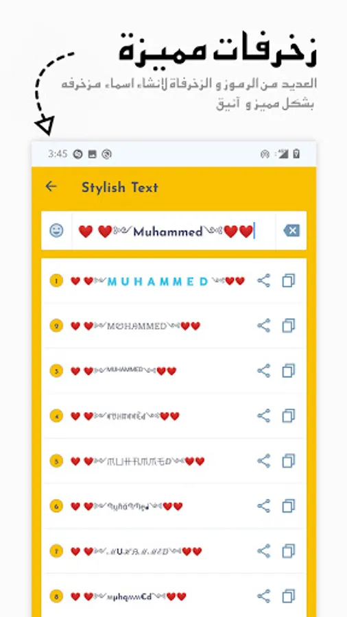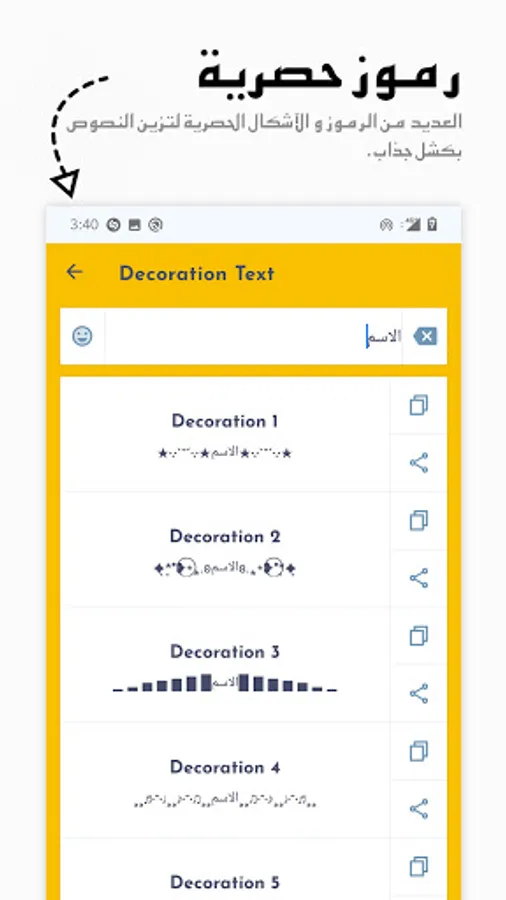 The application of text and names decoration is an application that contains many properties for decorating Arabic and English texts and to make names and texts beautifully decorated.