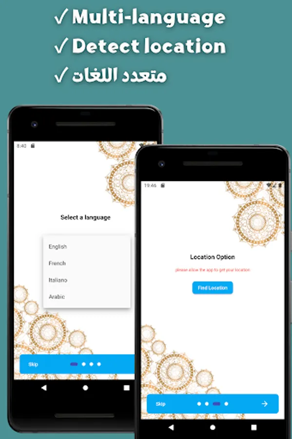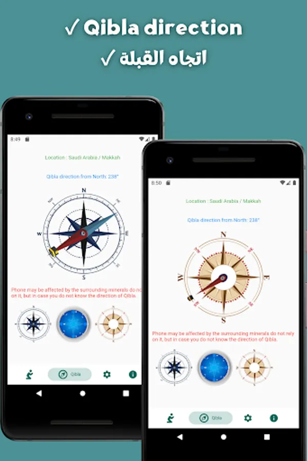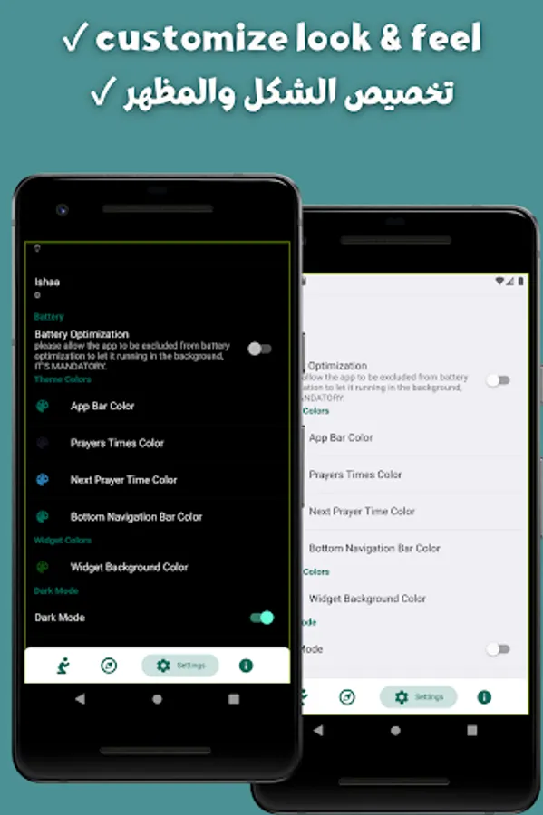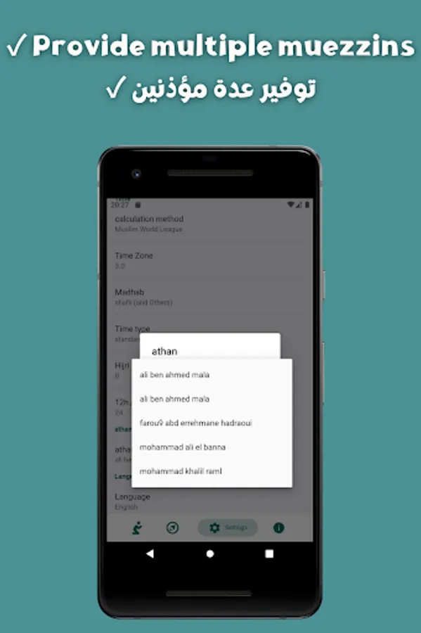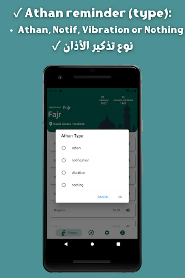 * You can choose the prayer remindeer type: Athan, vibration, silent notification or nothing