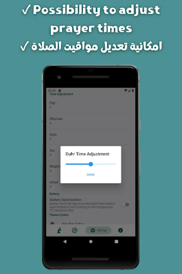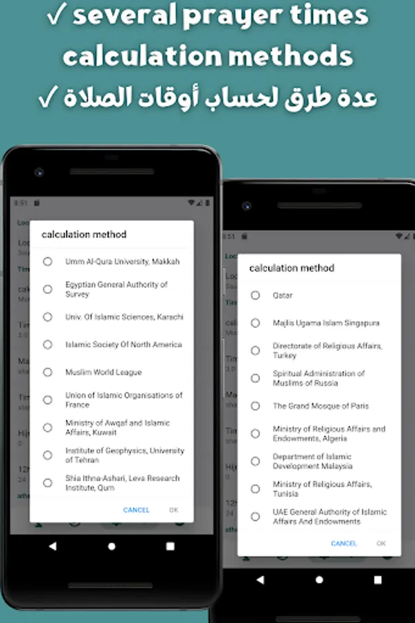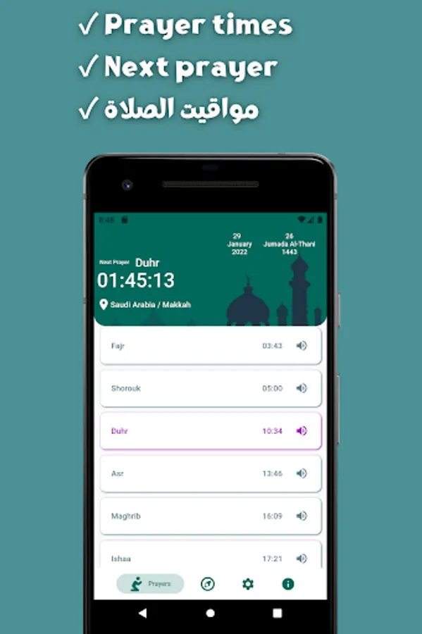 * يمكنك اختيار نوع تنبيه الصلاة: الأذان ، الاهتزاز أو التنبيه الصامت
