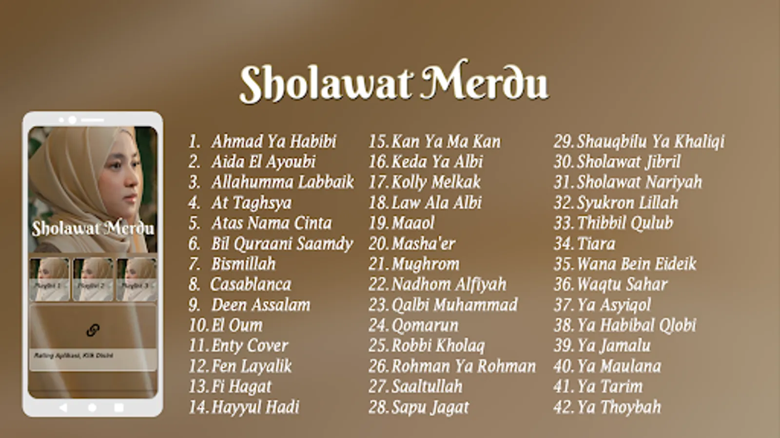 This application contains a collection of prayers from Nissa Sabyan which have been summarized into 3 playlists, all the songs can be listened to for free and offline so that your internet quota is safe and won't be cut in the slightest.