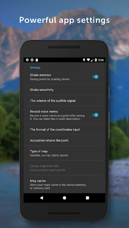- Save geopoints when shaking the phone. Set geopoints different colors, shapes and sizes.