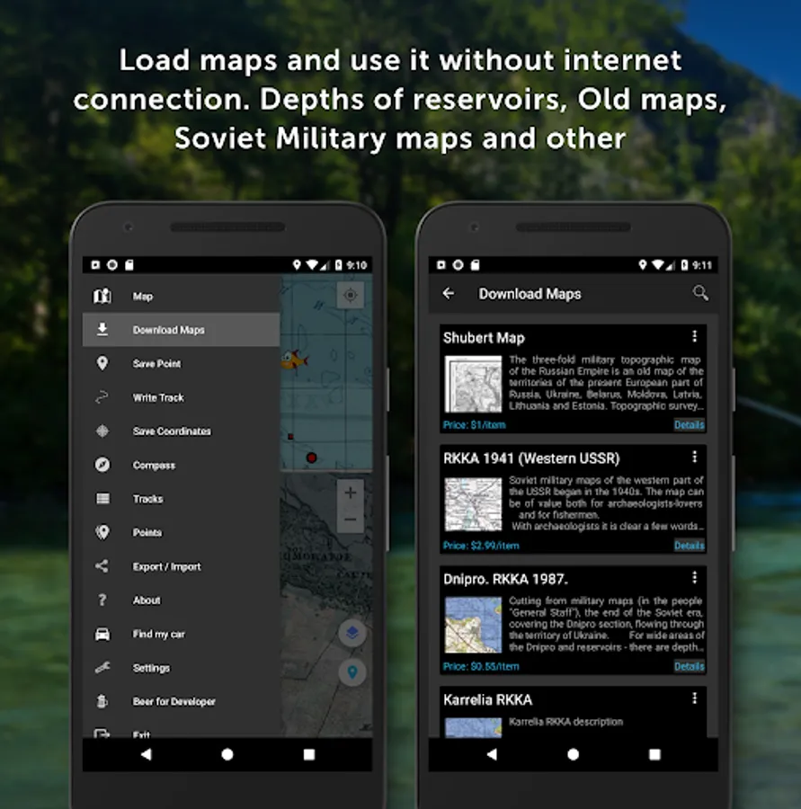- Any kinds of Offline Maps for every taste: fishing (with depths), historical (Schubert, Mende, Red Army), topographic (General Staff, Open Street Maps) and others