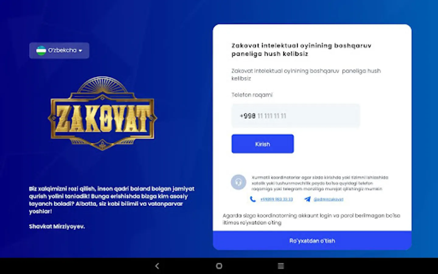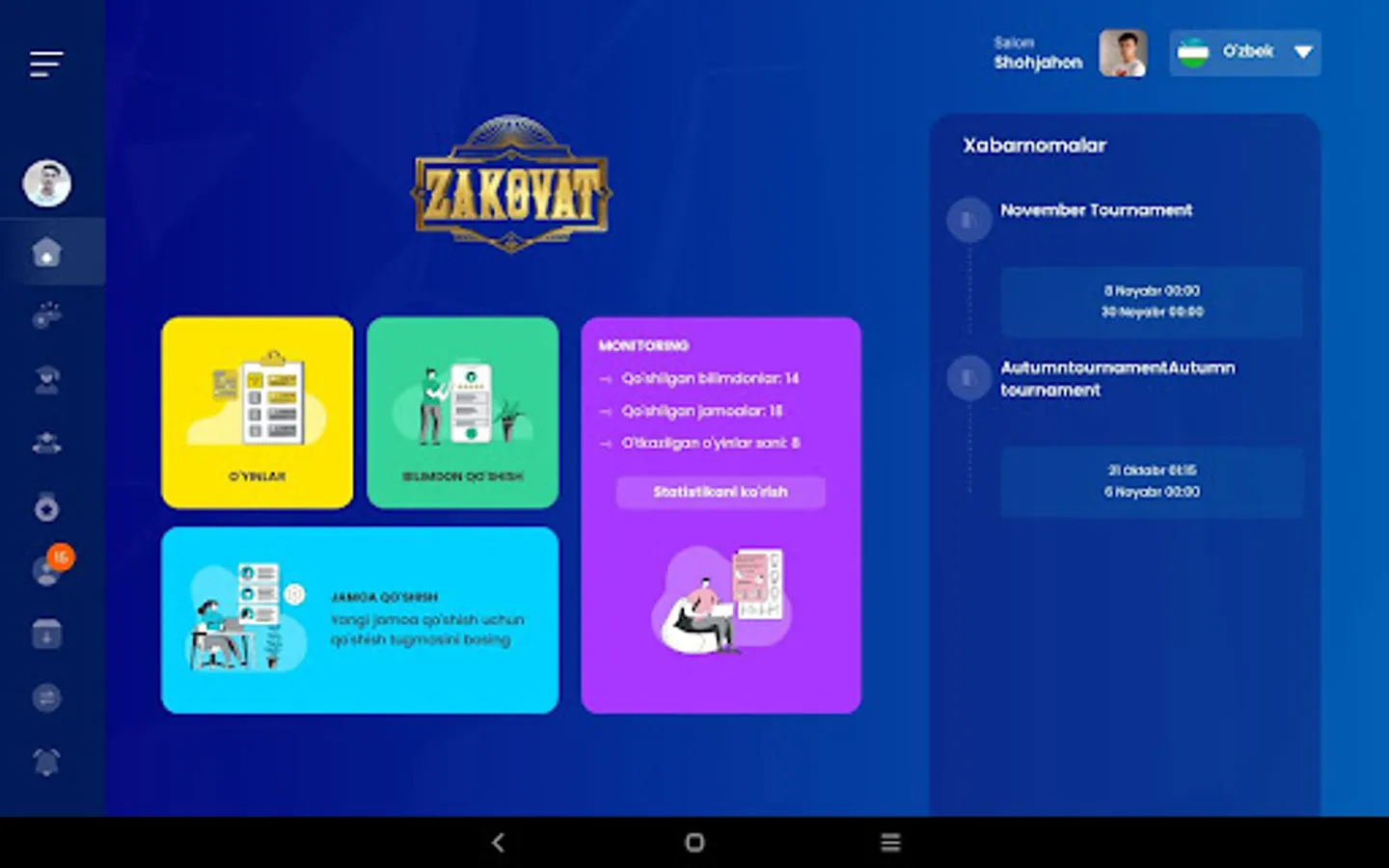Zakovat klubining ushbu rasmiy ilovasi Zakovat klubining barcha bilimdonlari uchun mo'ljallangan. Unda bilimdonlar televizion va mahalliy o'yinlarning natijalarini kuzatib borishi, eng so'ngi yangiliklar va tadbirlardan xabardor bo'lishlari, jamoaviy o'yinlarda va alohida quiz-viktorinalarda qatnashishlari va yana bir qator imkoniyatlari ega mkin'lish.