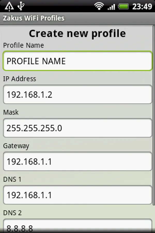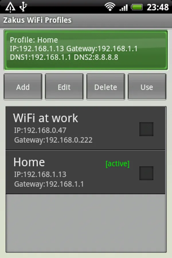 This utility application allows you to store different network (WiFi) settings (devices IP-address, gateway IP-address etc.), and switch from one settings to another with only two clicks. In other words, application allows to create and manage WiFi profiles.