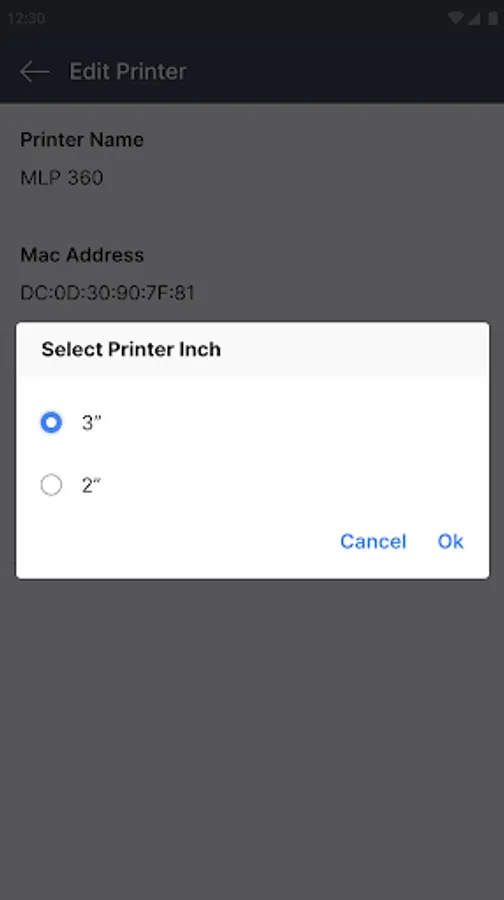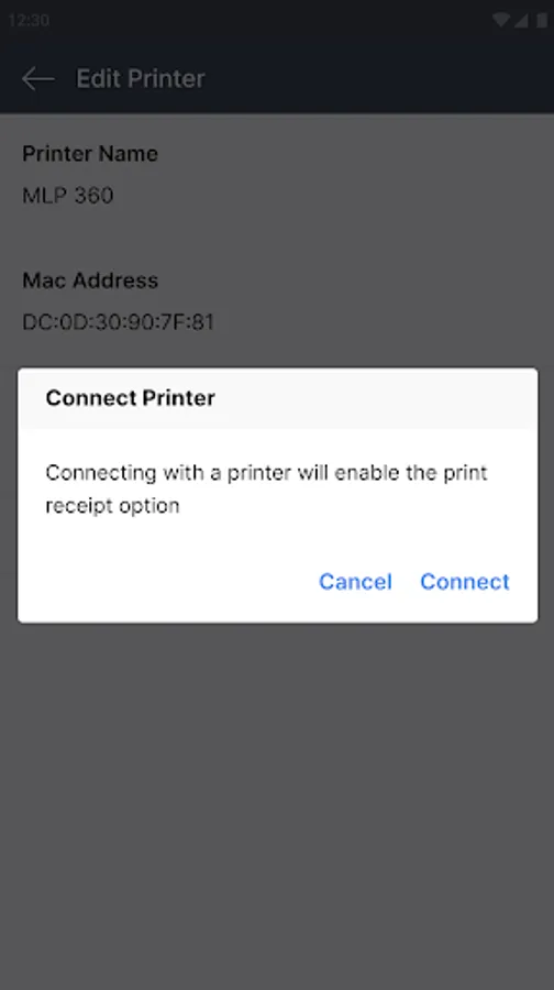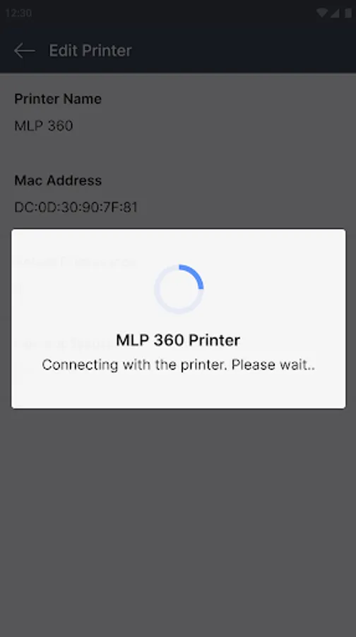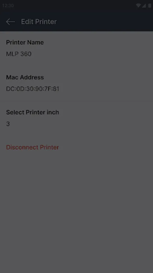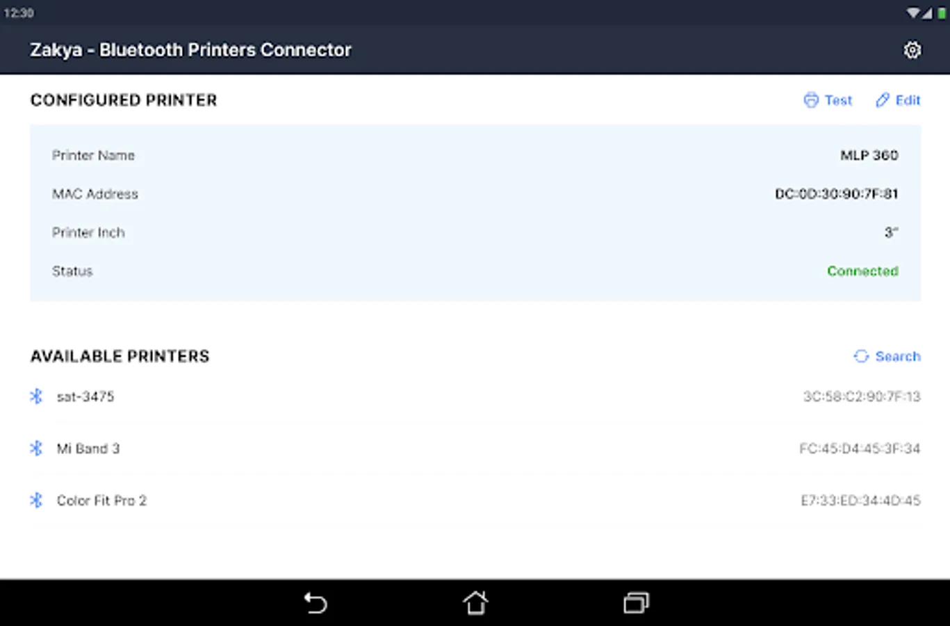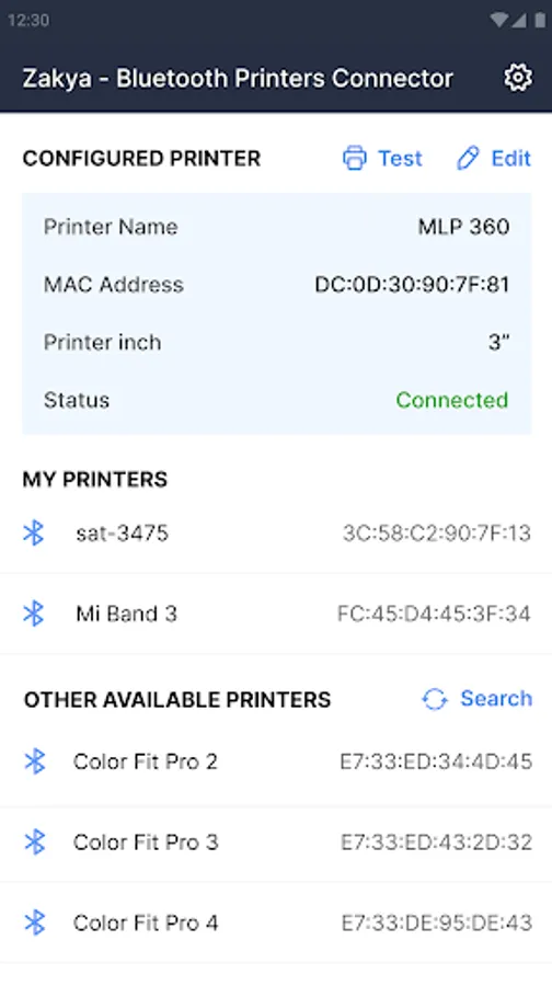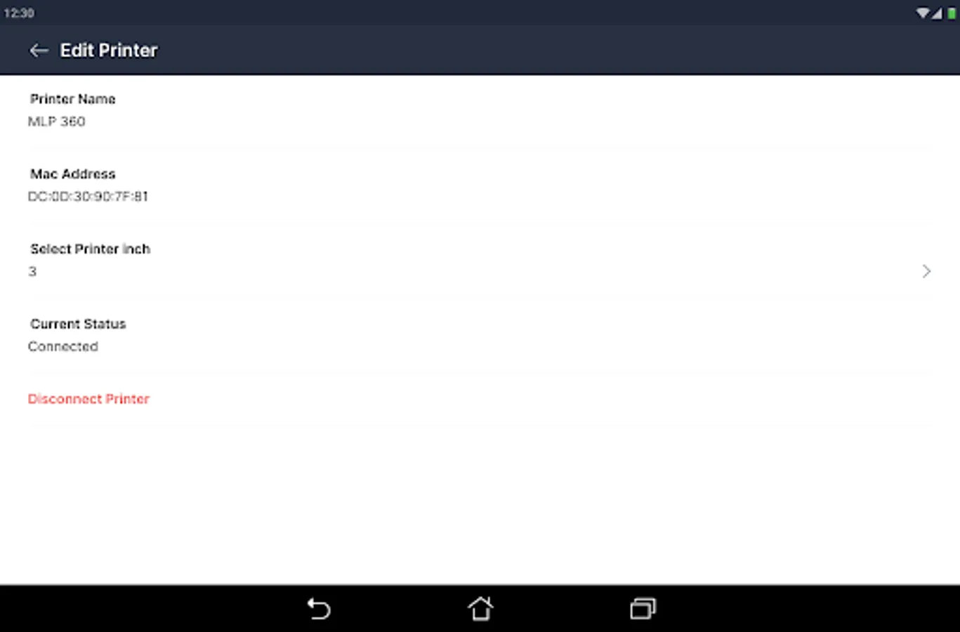 The app displays a list of all the bluetooth printers available around the network area. The user can click on a printer, configure the paper size and connect the printer.