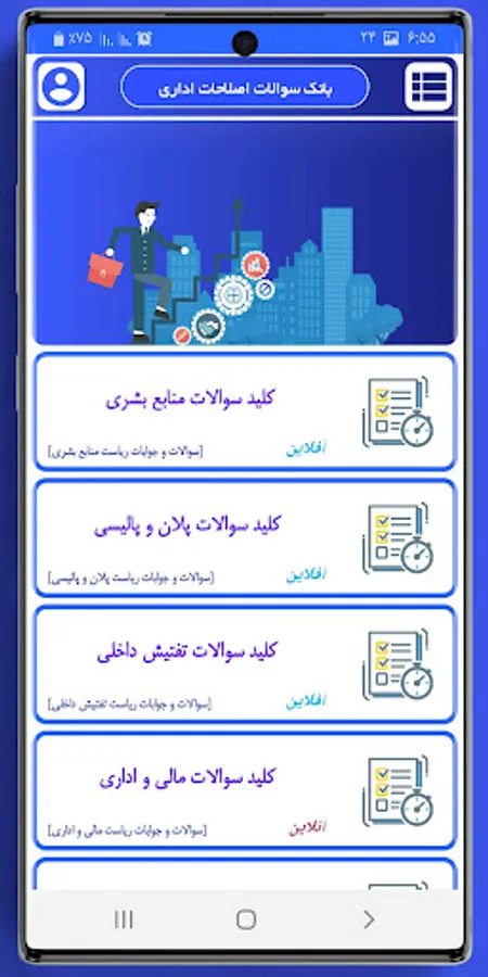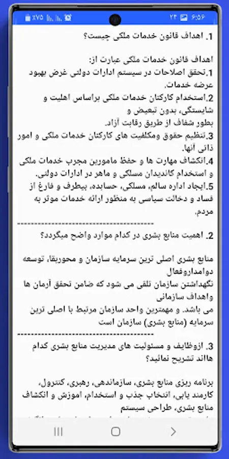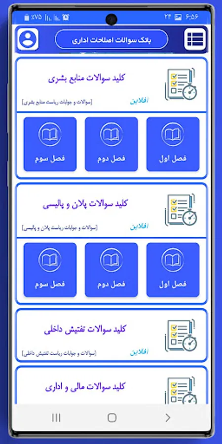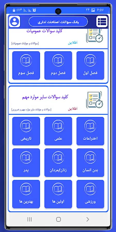 Department of Human Resources 79 questions and answers; Department of Foreign Relations 94 questions and answers; Internal Audit Department 21 questions and answers; Finance and Administration Department 497 questions and answers; Department of Planning and Policy 78 questions and answers; Department of Information Technology 91 questions and answers; General Directorate of Real Estate 59 questions and answers; Enterprises, state-owned and mixed companies 68 questions and answers; Procurement Department 122 questions and answers; Press, Media and Public Relations 42 questions and answers; Insurance section 50 questions and answers; Customs section 262 questions and answers; Election Complaints Section 83 questions and answers; Department of Analysis and Review 109 questions and answers; Regulation of Intrinsic Affairs of Civil Service Employees 57 questions and answers; General section 40 questions and answers; Civil Service Employees Act 232 questions and answers; Constitution 20 questions and answers; Inventions 18 questions and answers; The human body 13 questions and answers; Father 18 questions and answers; Men and women 13 questions and answers; General and historical 78 questions and answers; Scientific 166 questions and answers; Sports 18 questions and answers; The first 78 questions and answers; The best 30 questions and answers; Prophets 141 questions and answers; Cities and countries 43 questions and answers; Quranic 250 questions and answers; Islamic 74 questions and answers