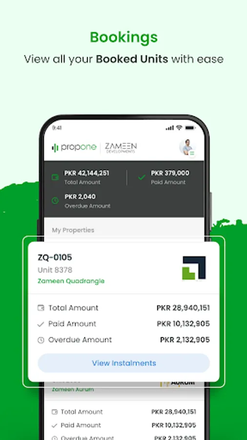 Users can dive deep into their Property Portfolios to Track bookings, Installment plans, Payments, and Taxes on their properties.