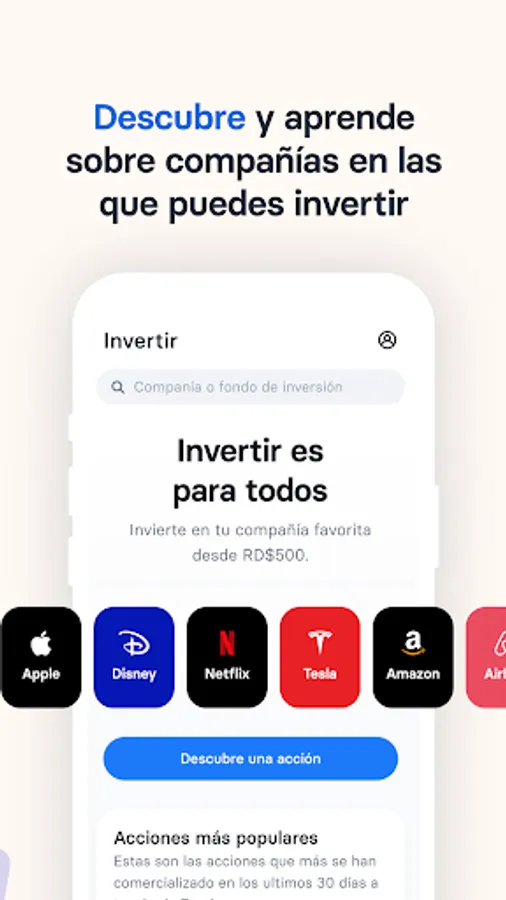 Zami allows you to invest in hundreds of companies listed on the US stock market. Minimum 500 Dominican pesos.