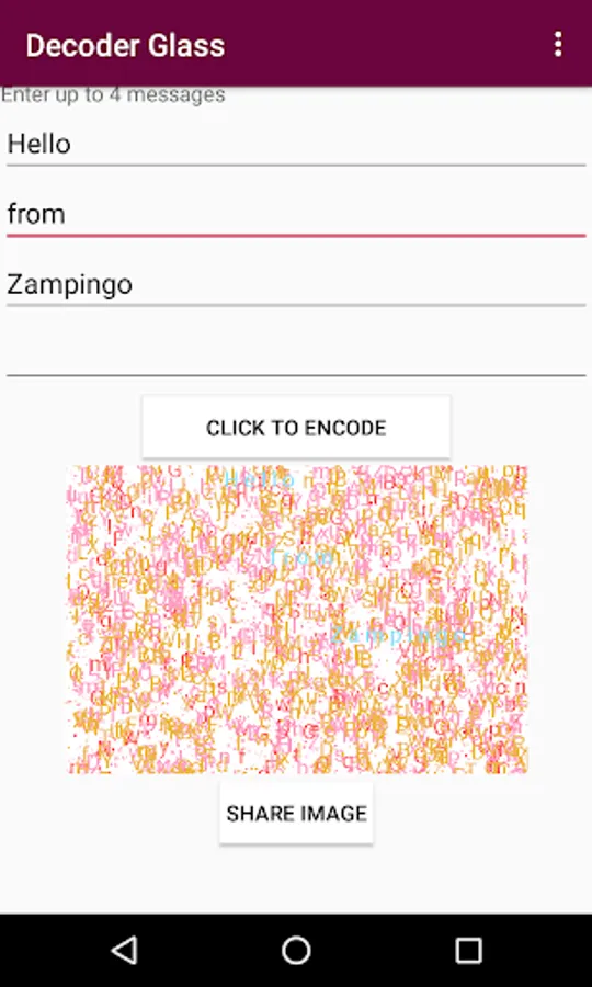 There are two ways to create a secret message: follow the "Do It Yourself" steps described in the app, or let the app do all the work for you! You can enter a message, have the app hide it in a mesh of color, then export the image to print or view on a screen. As long as your friends have the app, they'll be able to read your secret message!