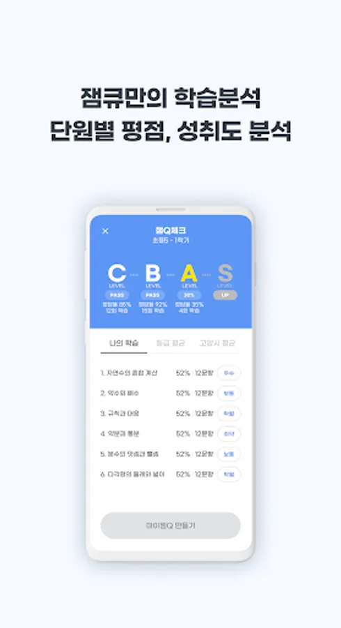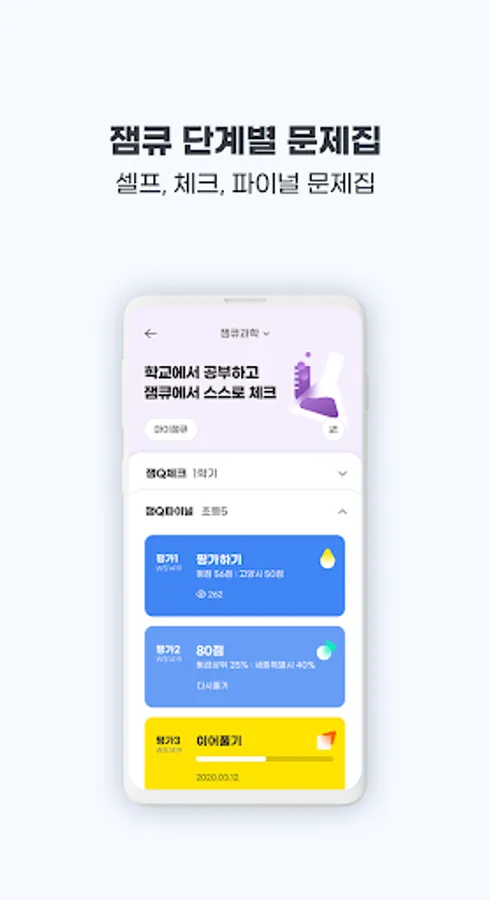 - 잼Q셀프, 잼Q체크, 잼Q 파이널의 다양한 문제 유형, 단계별 난의도 레벨업 서비스.