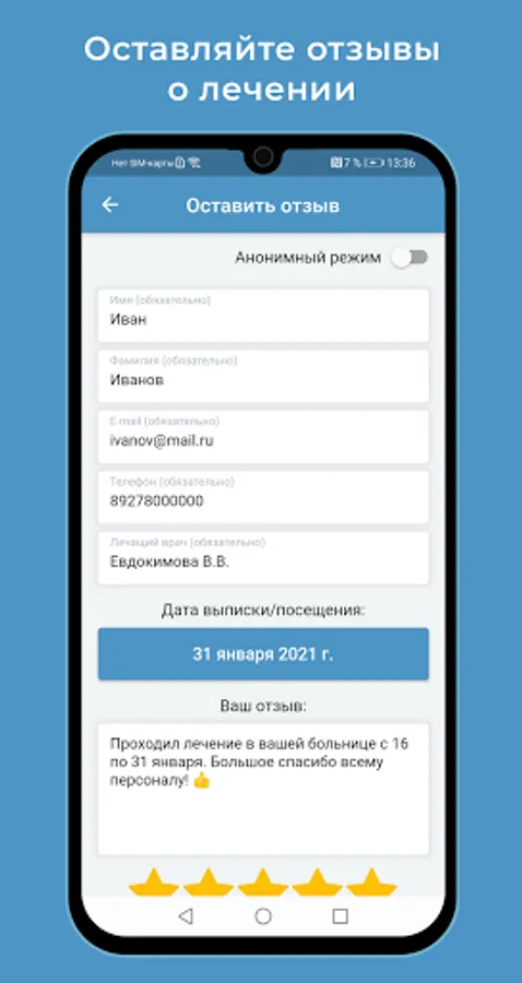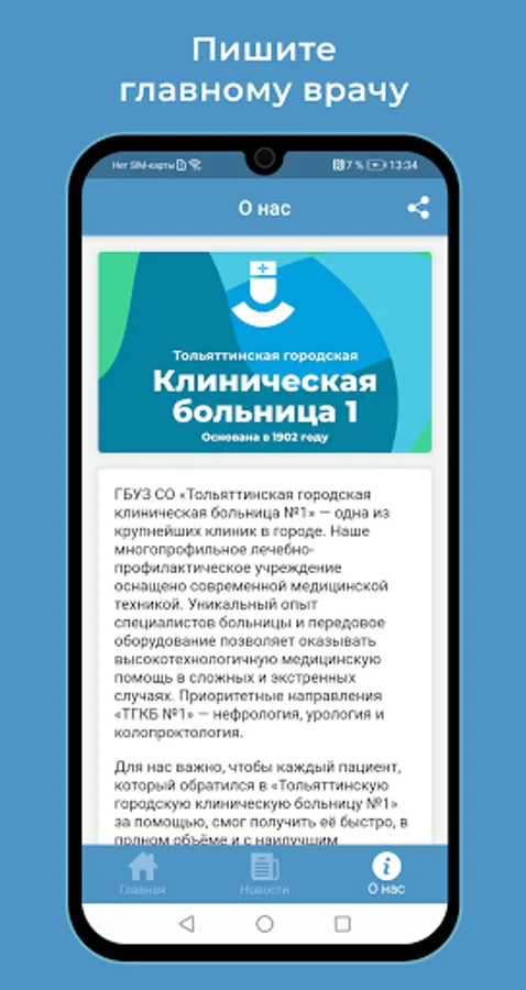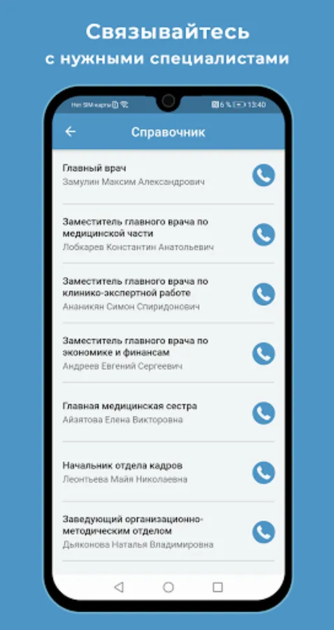 By installing our application, you can write a review of the treatment, get directions to the hospital, make an appointment with a doctor, use a convenient telephone directory, and also contact the head doctor of the hospital.
