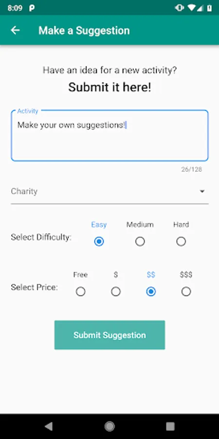 Have a suggestion for a task? Submit it through the app and we will add it to our database for other users to see!