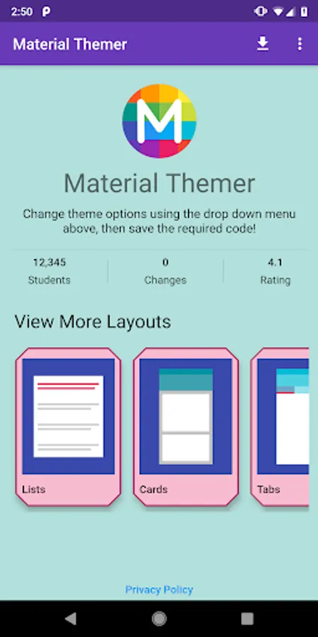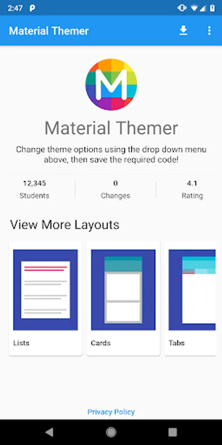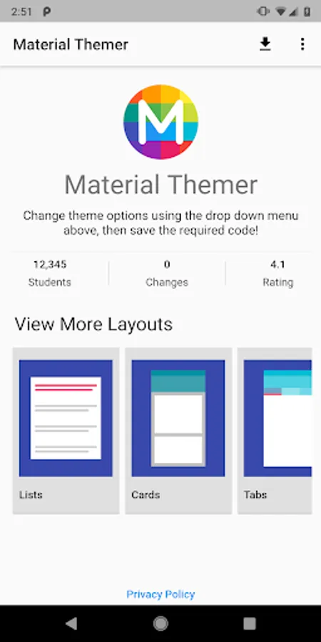 Material Themer takes the guesswork out of designing an app as a developer. You can see the choices you are making reflected in real-time without having to write any code or rebuild the app. In a few minutes you can tweak your design dozens of times and settle on a final product, and with a click of a button, generate all the code necessary for your design!