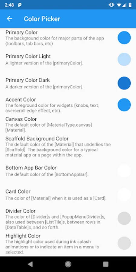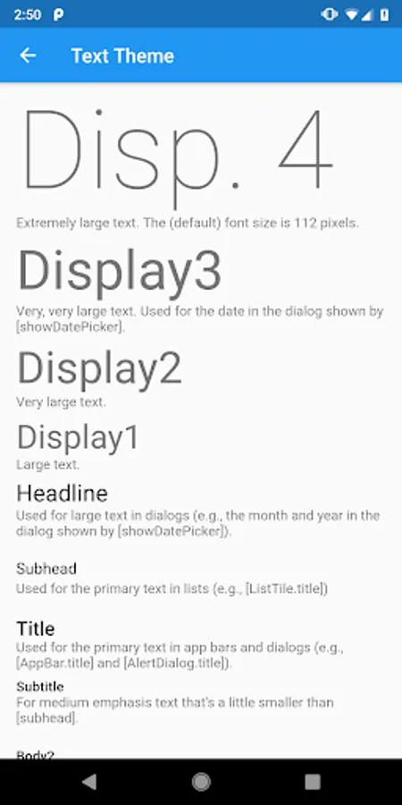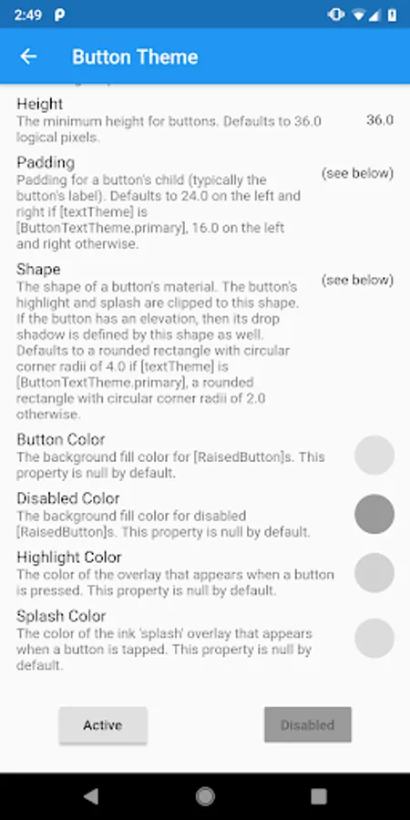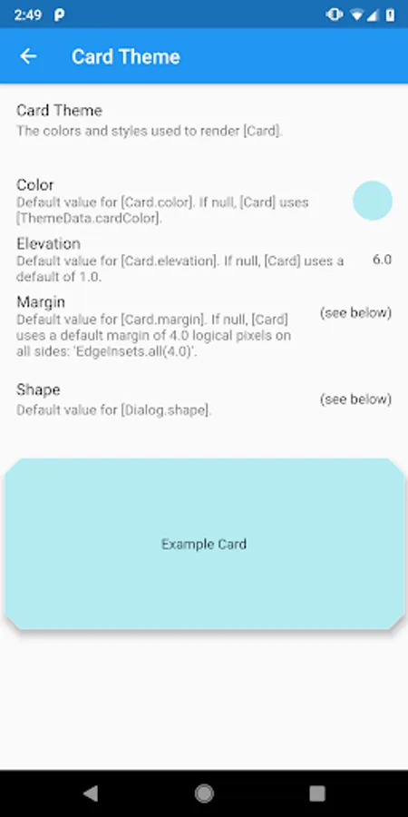 Using the Material Themer makes it easy to understand how the Flutter ThemeData components affect the overall look and feel of your app. Not only can you see the changes happening live, but each modifiable field is accompanied by the documentation taken directly from the Flutter SDK code.