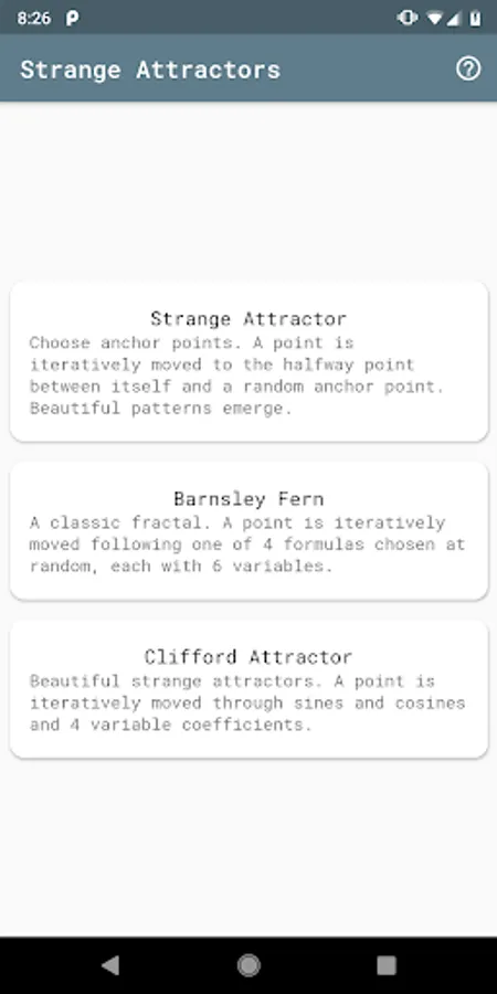 This app shows off some of the beauty of mathematics. Fractals, strange attractors, and more!