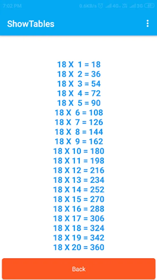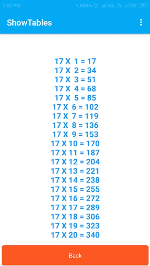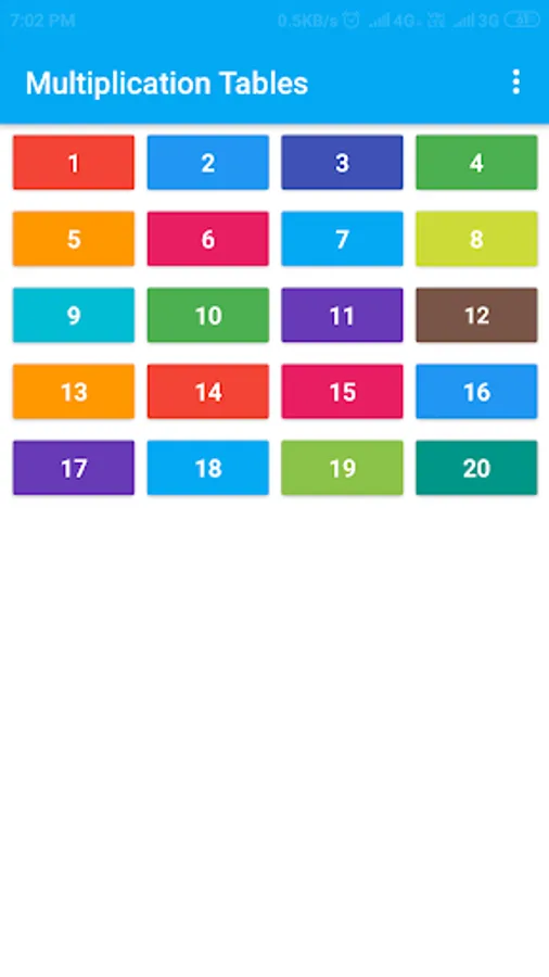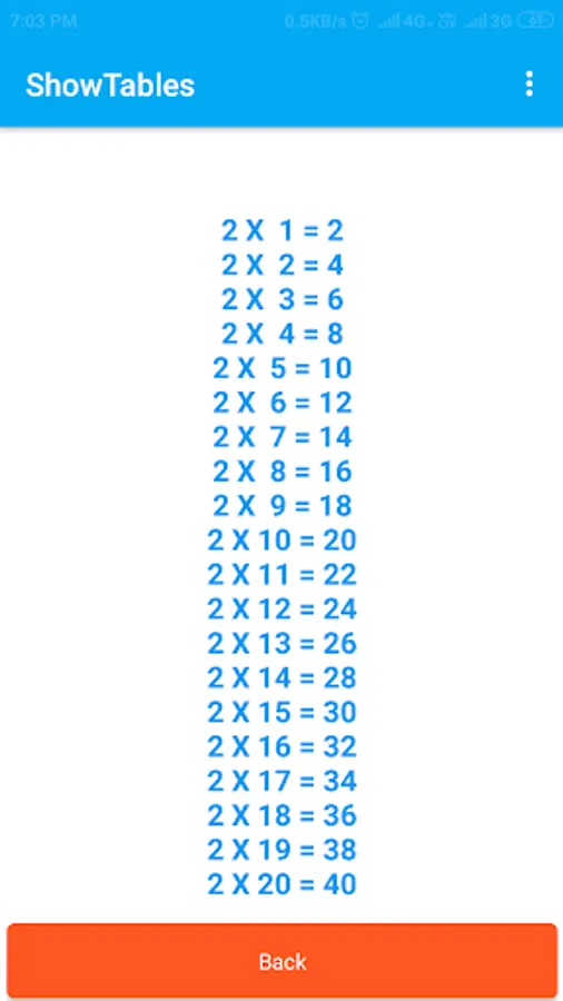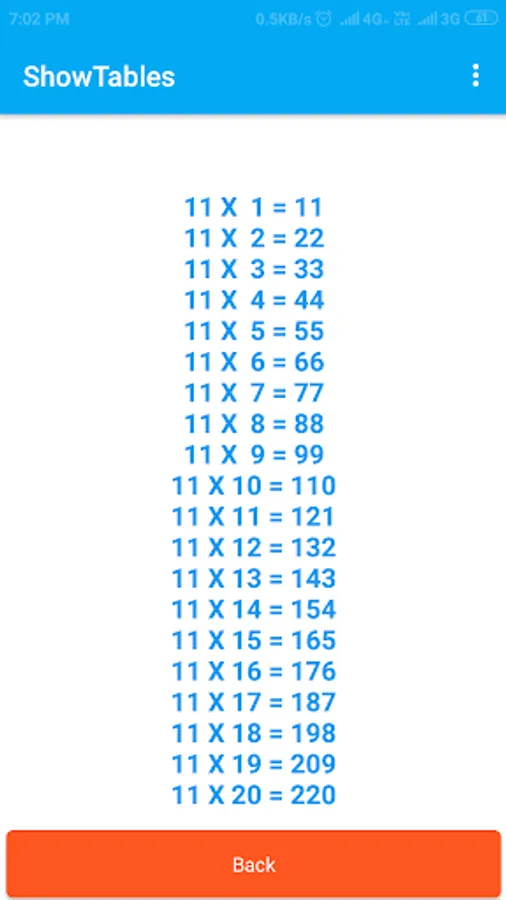 Multiplication Tables app shows the table from 1 to 20 multiplication values.