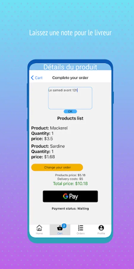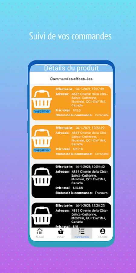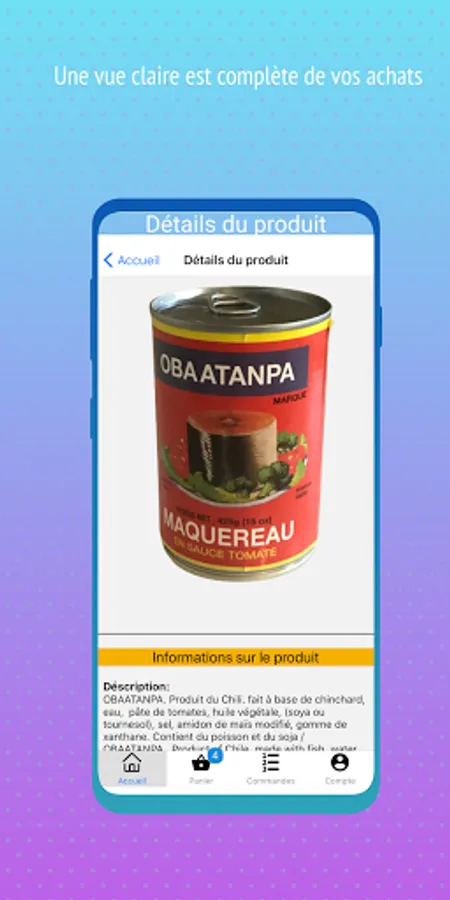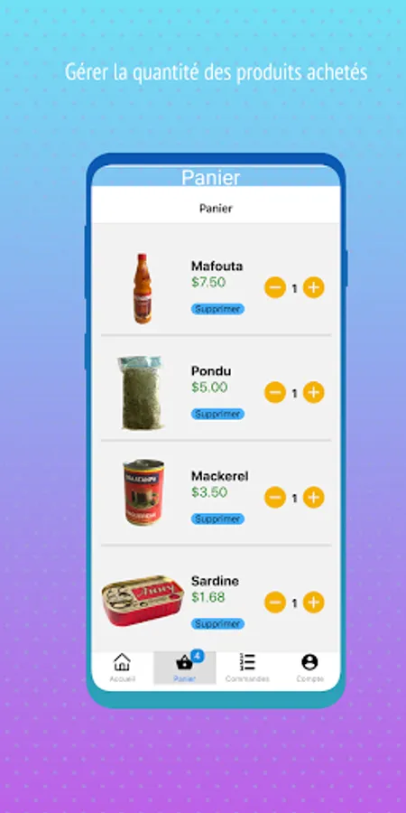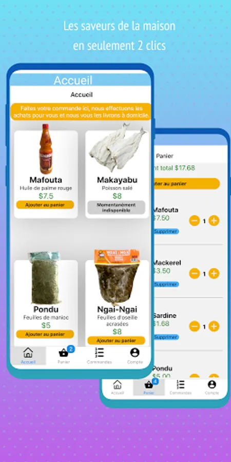 This application allows you to make purchases of your favorite foods (Pondu, Makayabu, ...), in just a few clicks. It provides you with the following features: