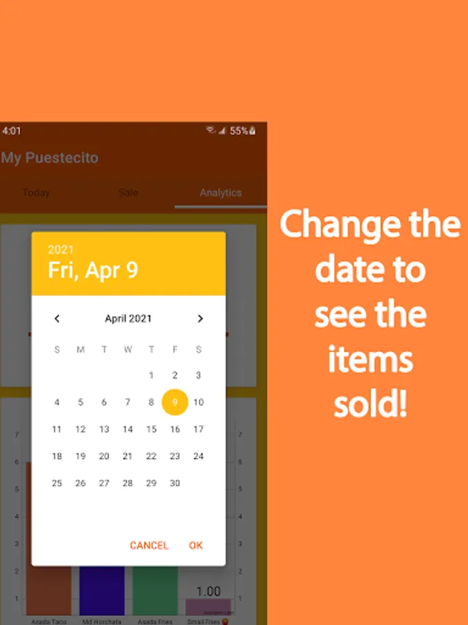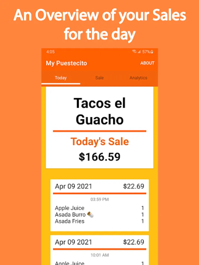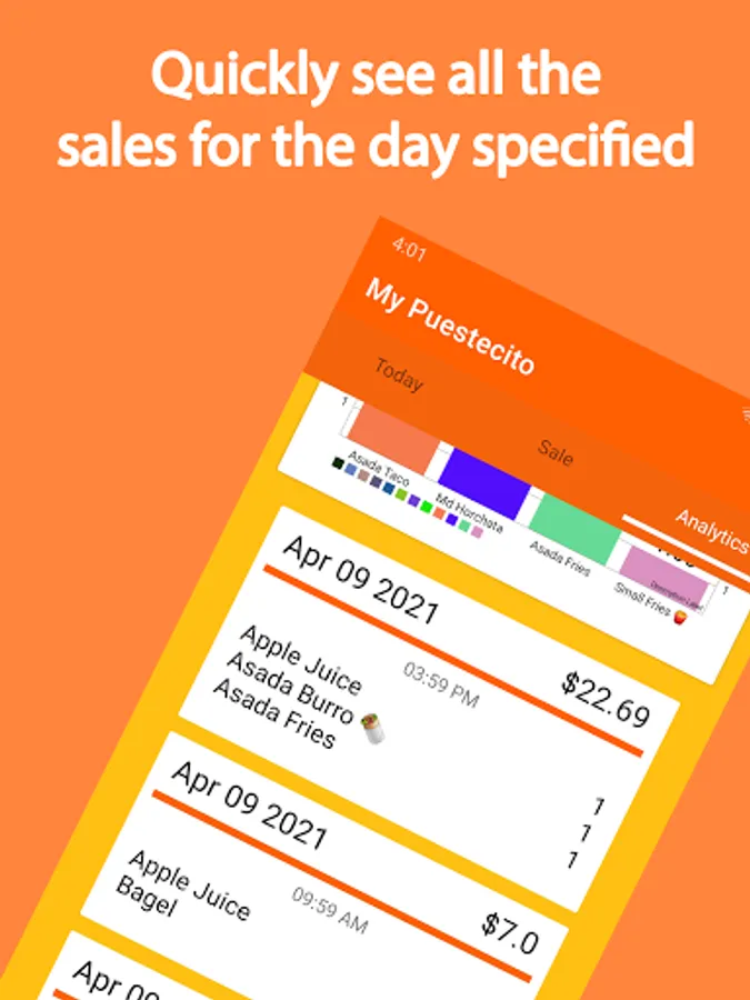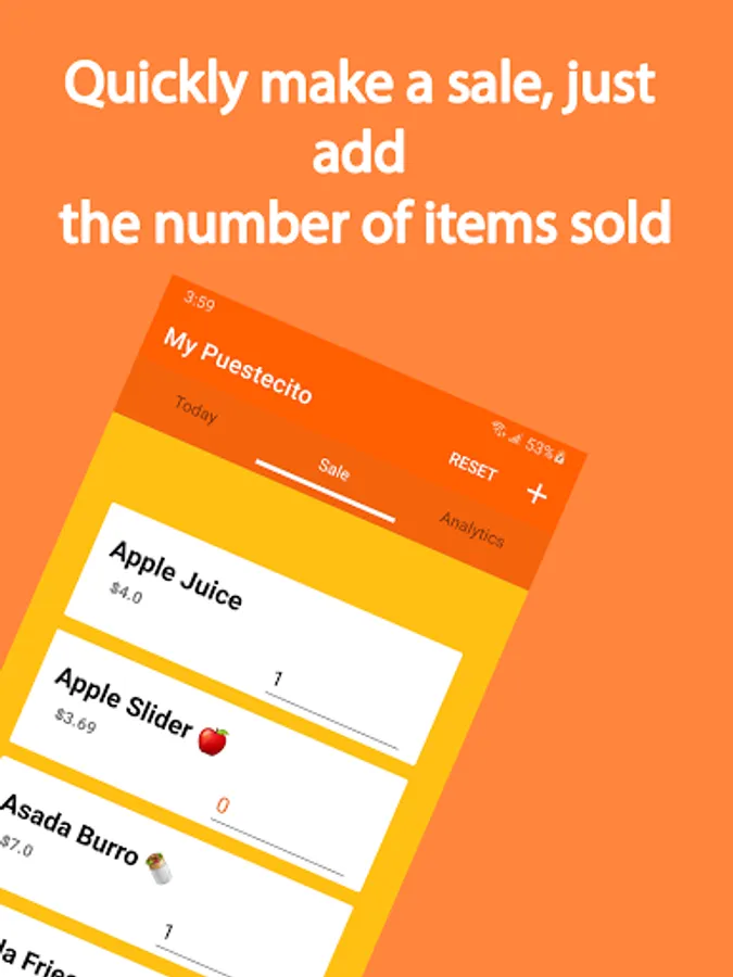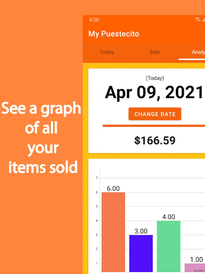 My Puestecito is designed to help you keep track of your businesses, products, and sales. In a simple easy to use design, you are able to easily see the products and their prices. When taking the order of a client, you can easily and quickly see the sum total of the order. When ready to charge your client, you can verify the order and see only the products being sold and inclusively calculate the change to return to your client or if they are missing to complete the purchase.