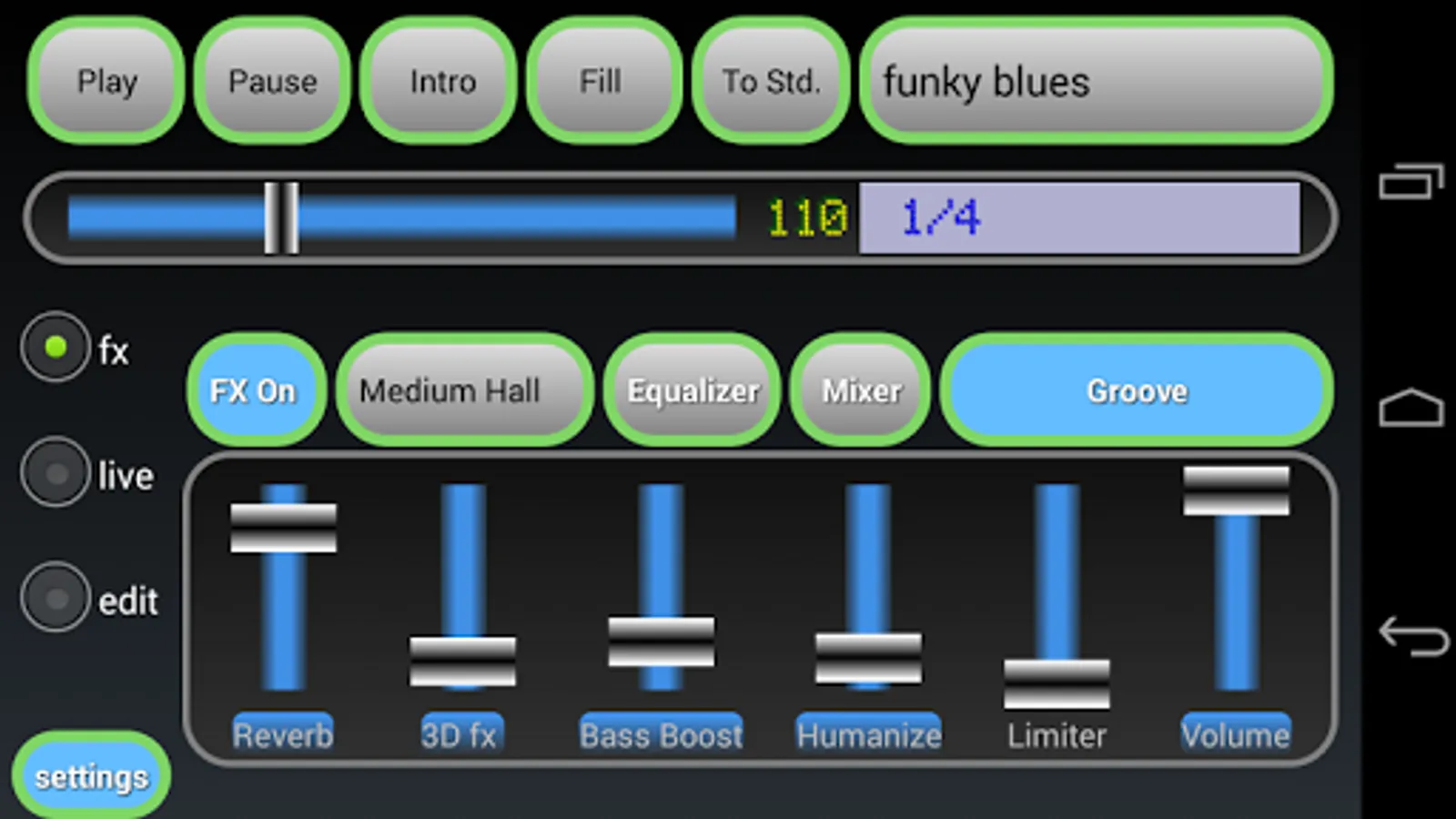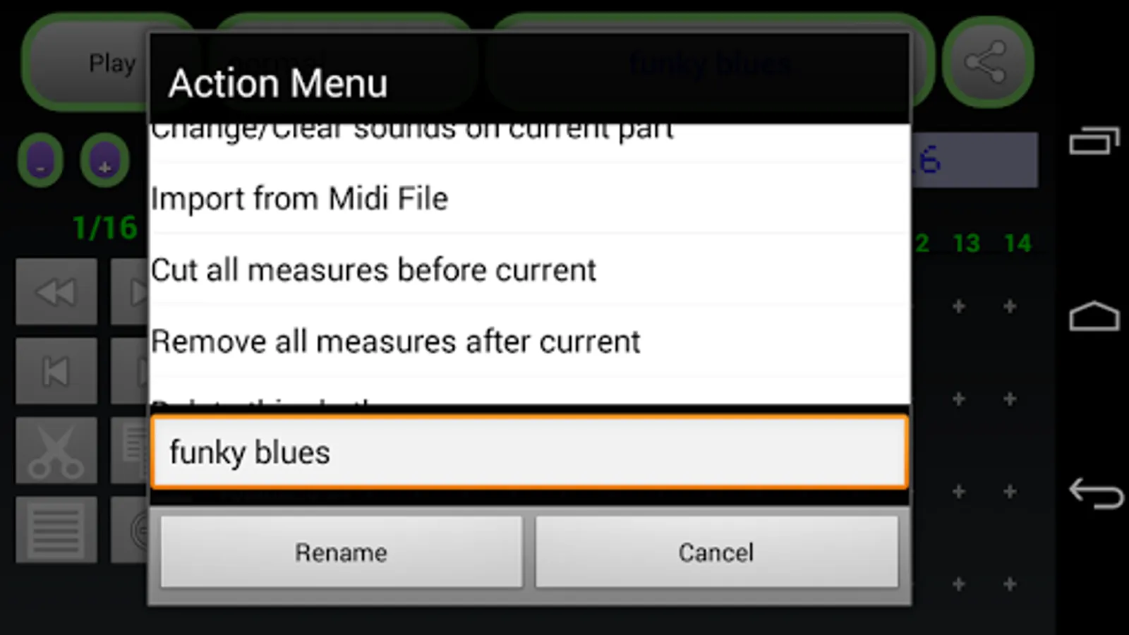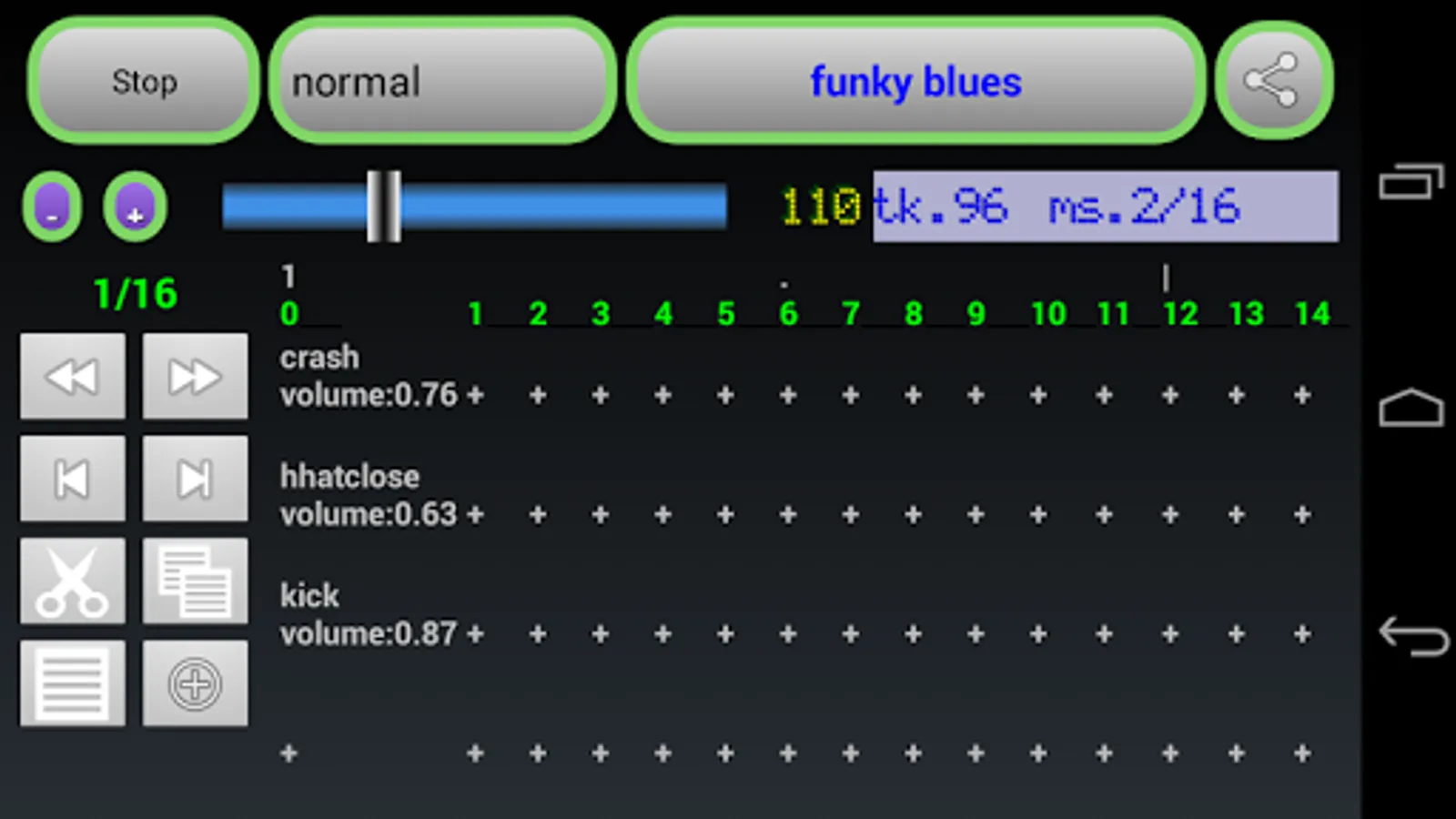 Editor: to modify an existing rhythm select it from main app and simply touch the edit checkbox, then the rhythm editor will be started and show four tracks of events view with some controls in the upper part of screen.