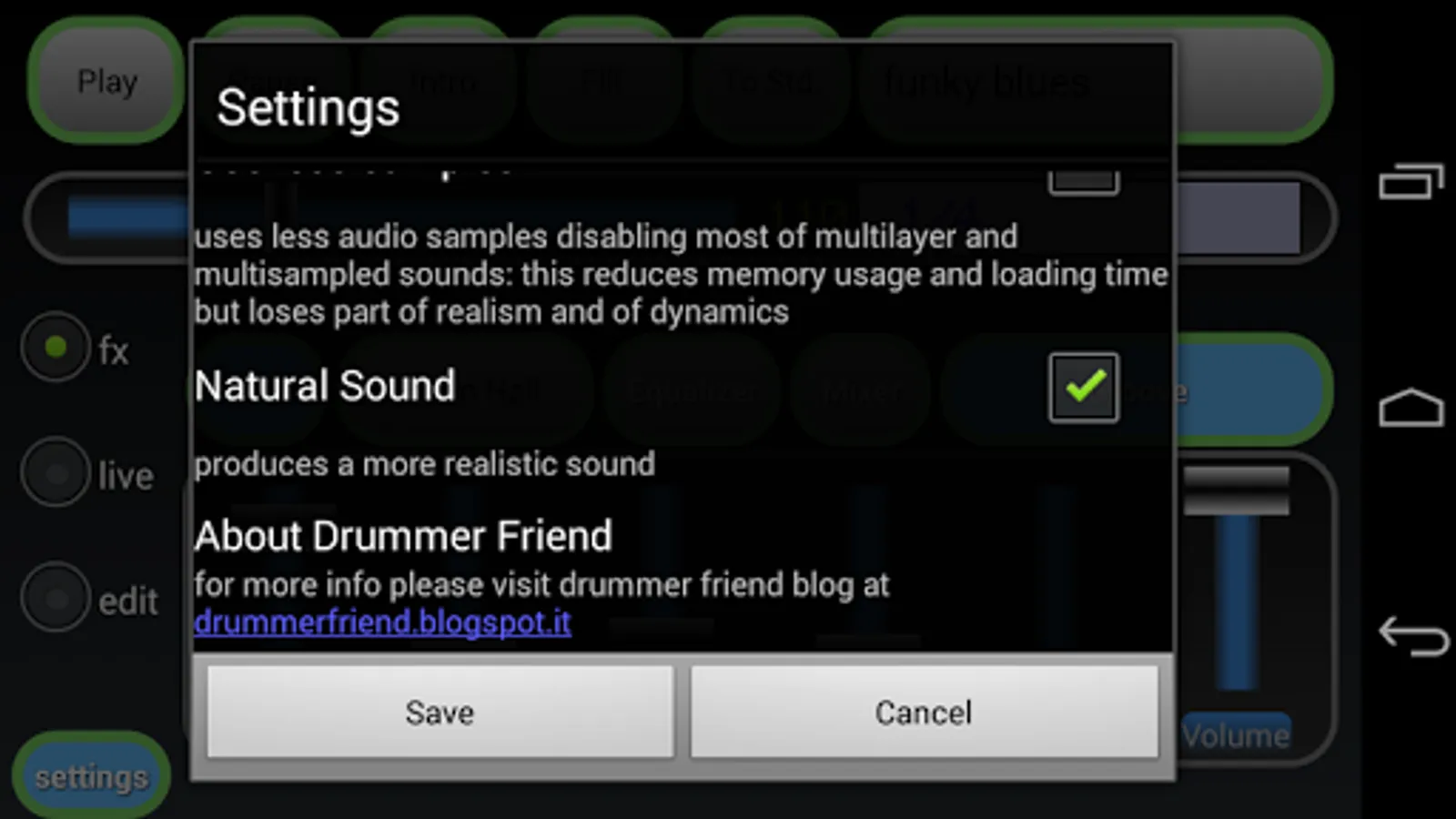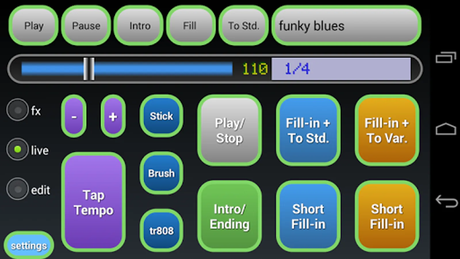 Preset drum machine (also programmable) for live playing with your preferred musical instrument.