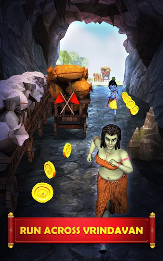 Now follow Little Krishna while he chases Putana across Vrindavan and bring her to justice for her evil deeds. Enjoy an all new Gameplay Experience and challenges that Vrindavan has to offer and have lots of fun conquering obstacles in your way. Avoid raging bulls, angry elephants, hot lava streams and more. Acquire tokens on the run to unlock Characters with specific abilities. Collect as many coins as you can and score highest among your friends, in this challenging 3D game.