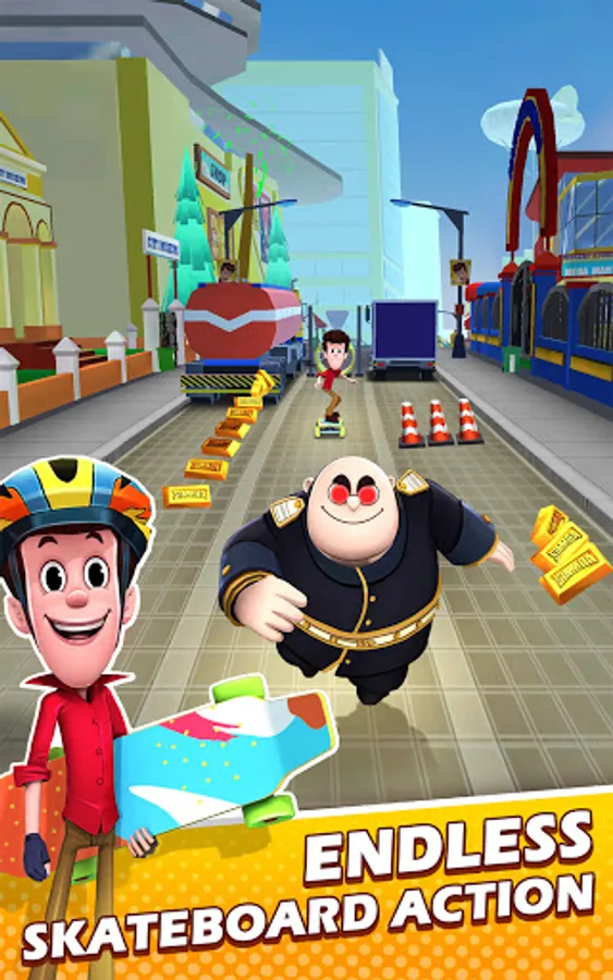 Hop in for a thrilling ride and help Simmba capture the troublesome vandal, Raka. Hit the asphalt on your skateboard and explore the beautiful town and its lanes. Perform stunts on ledges, making way through obstacles, bouncing on trampolines, grinding pipes & half-pipes, and collecting lots of Gold. Spin around the bad guy magicians Aadha and Pauna, getting them confused and disoriented.
