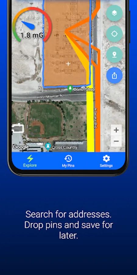 Measure EMF in “milligauss” units by dragging the map around the center crosshair.