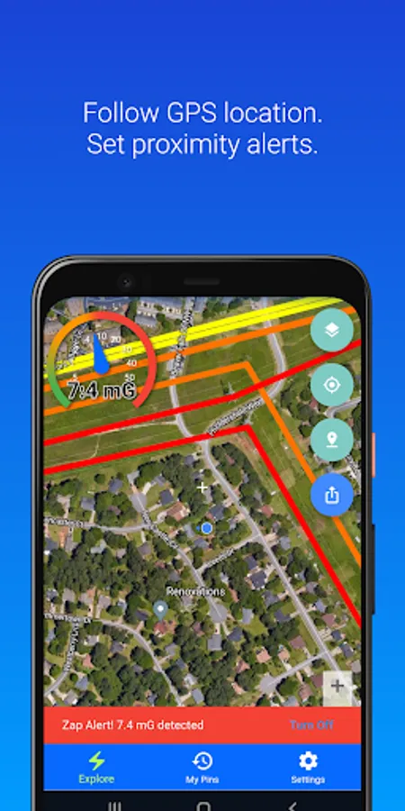 In GPS mode, ZapAtlas™ can follow the user’s location and generate a vibrating “Zap Alert” when a high EMF measurement is detected.