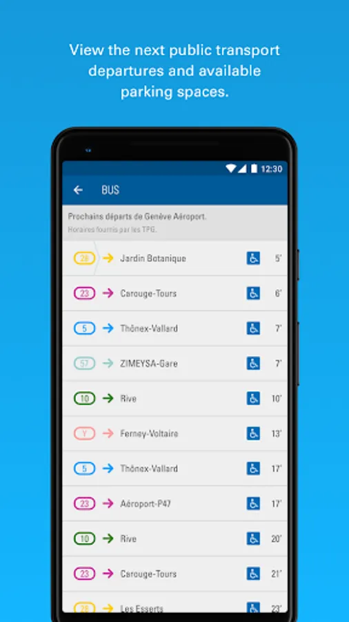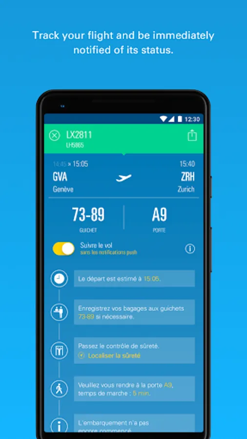 The application allows you to track any flight departing from or arriving at Genève Aéroport. The tracking function allows you not only to have easy access to the flight file but also to be notified of any change in its status (push) and to activate the personal guide. You can access the right file directly by scanning the boarding pass. A simple click allows you to share the flight tracking information with your contacts!