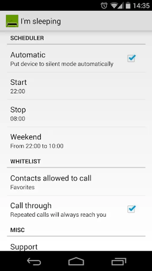 - white list: let a selected group of people from your contacts bypass sleep mode (favorites, all, none or specific group)